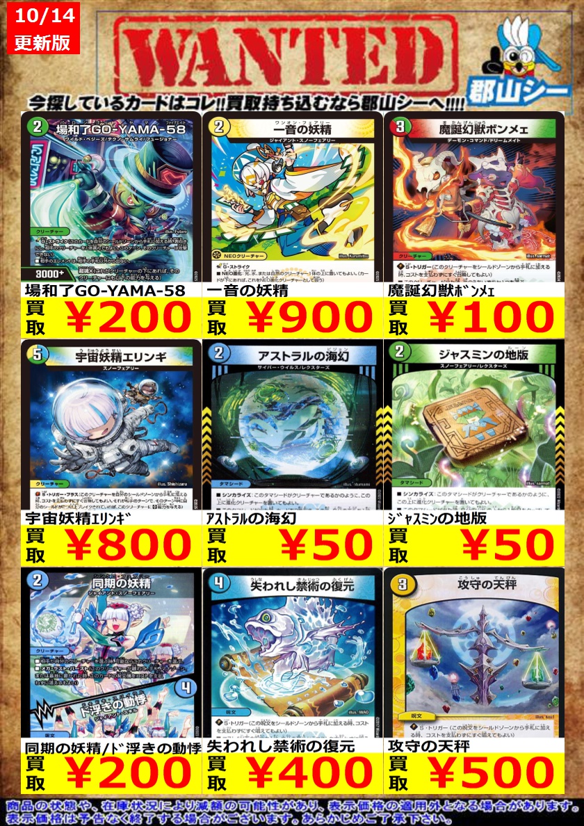 シーガル郡山店デュエマノーマルお買取り情報!! ※商品の状態や在庫状況により減額の可能性があり、表示価格の適用外となる場合がございます。 魔誕幻獣ボンメェ ¥100 場和了GO-YAMA-58 ¥200 一音の妖精 ¥900
