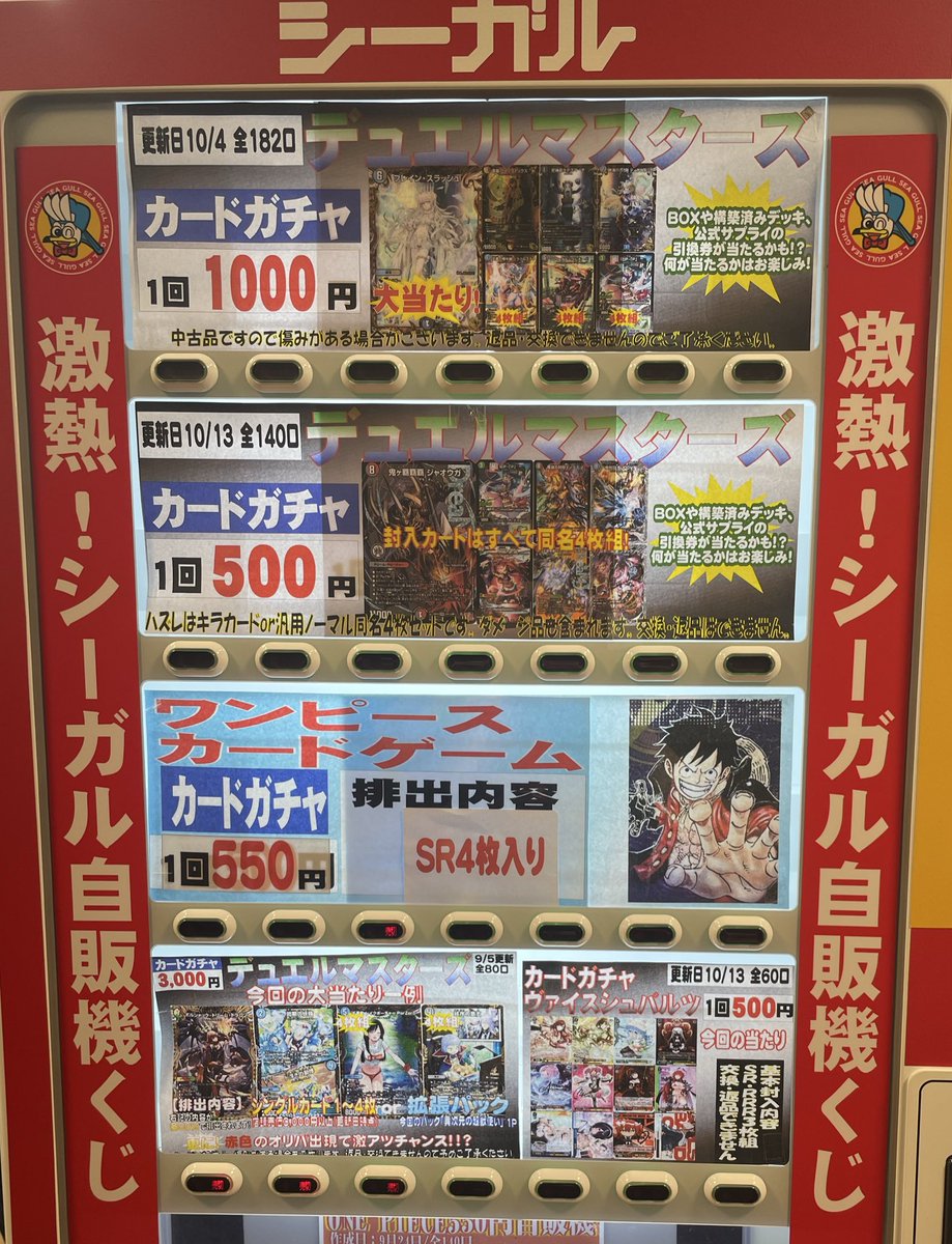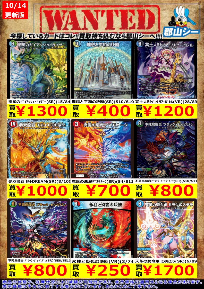 シーガル郡山店デュエマお買取り情報!! ※商品の状態や在庫状況により減額の可能性があり、表示価格の適用外となる場合がございます。 堕チシ八叉ノ蛇神(SR)(S11/S11) ¥200 危険深淵 デンジャラス=ジャック(SR)(S3/S11) ¥500 魔誕の悪魔デスモナーク(SR)(S4/S11) ¥700