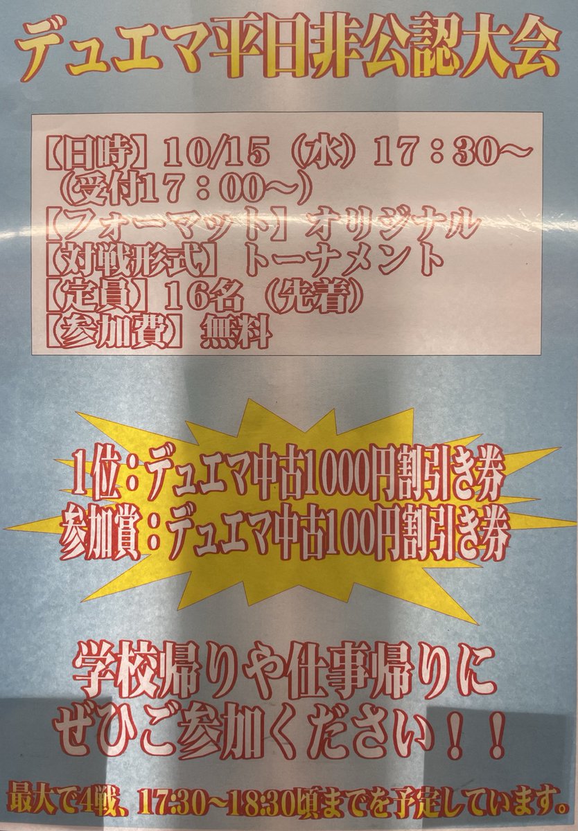 10月15日にデュエマ平日非公認大会を行います❗️ 参加費無料、優勝賞品はデュエマ中古1000円割引券です✨ ご参加お待ちしております🙇♂️