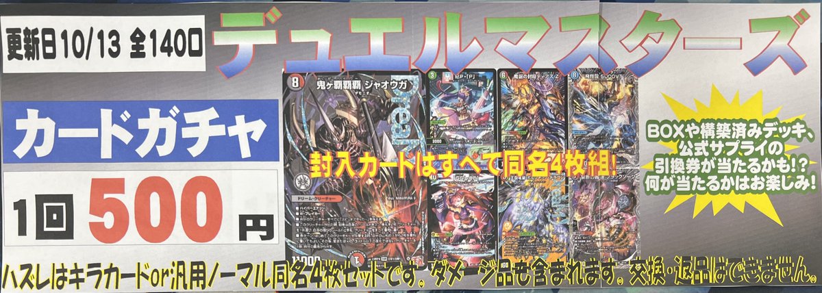 デュエマ500円自販機を更新致しました‼️ 覇覇覇ジャオウガやPPPなどが4枚組で当たっちゃいます✨️ 是非😁