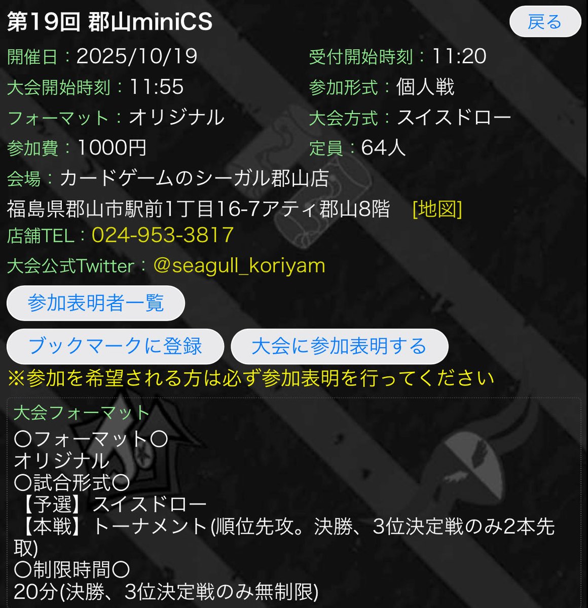 10/19 デュエマ郡山miniCS ( ) 参加表明が始まっております!! 以下の方は参加費無料✨️ ☆高校生 ☆CS初参加の方 参加賞パックは最新弾デュエキング👑✨️ 予選後に恒例の抽選会もあります! たくさんのご参加お待ちしております〜😁