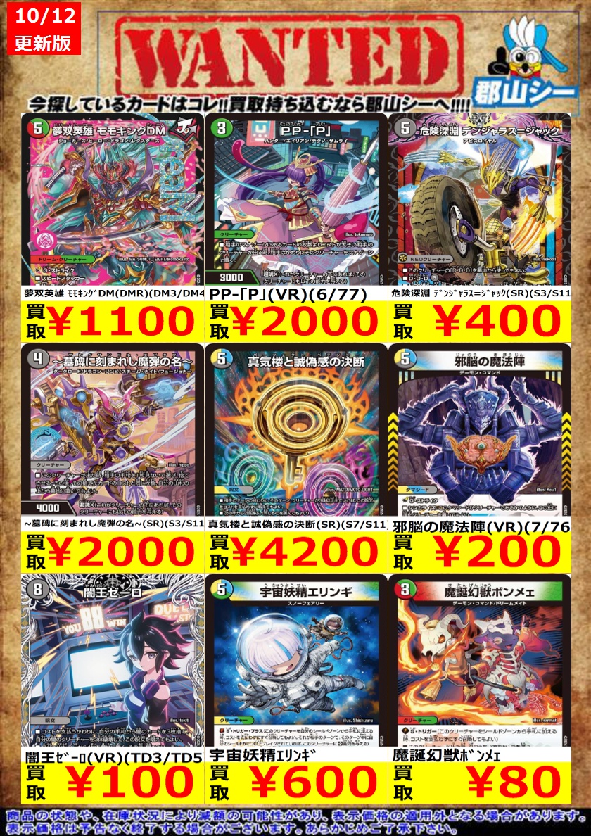 シーガル郡山店デュエマノーマルお買取り情報!! ※商品の状態や在庫状況により減額の可能性があり、表示価格の適用外となる場合がございます。 魔誕幻獣ボンメェ ¥80 場和了GO-YAMA-58 ¥300 危険深淵 デンジャラス=ジャック(SR)(S3/S11) ¥400