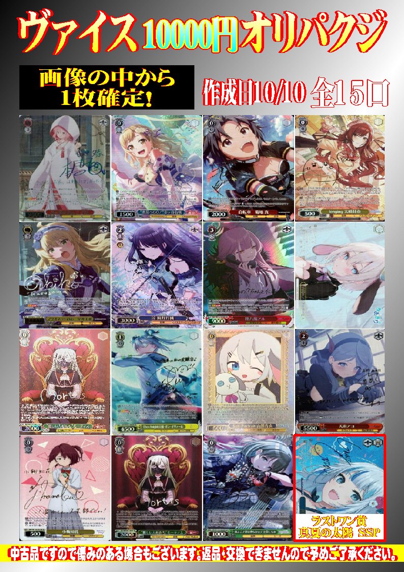 シーガル郡山店ヴァイス担当です( ・∇・) ヴァイスシュバルツ 10000円オリパクジ 作成しました!!(`✧∀✧´) 画像の中から確定&ラストワン賞あり✨ 全15口となっております!! よろしくお願いします‼️‼️