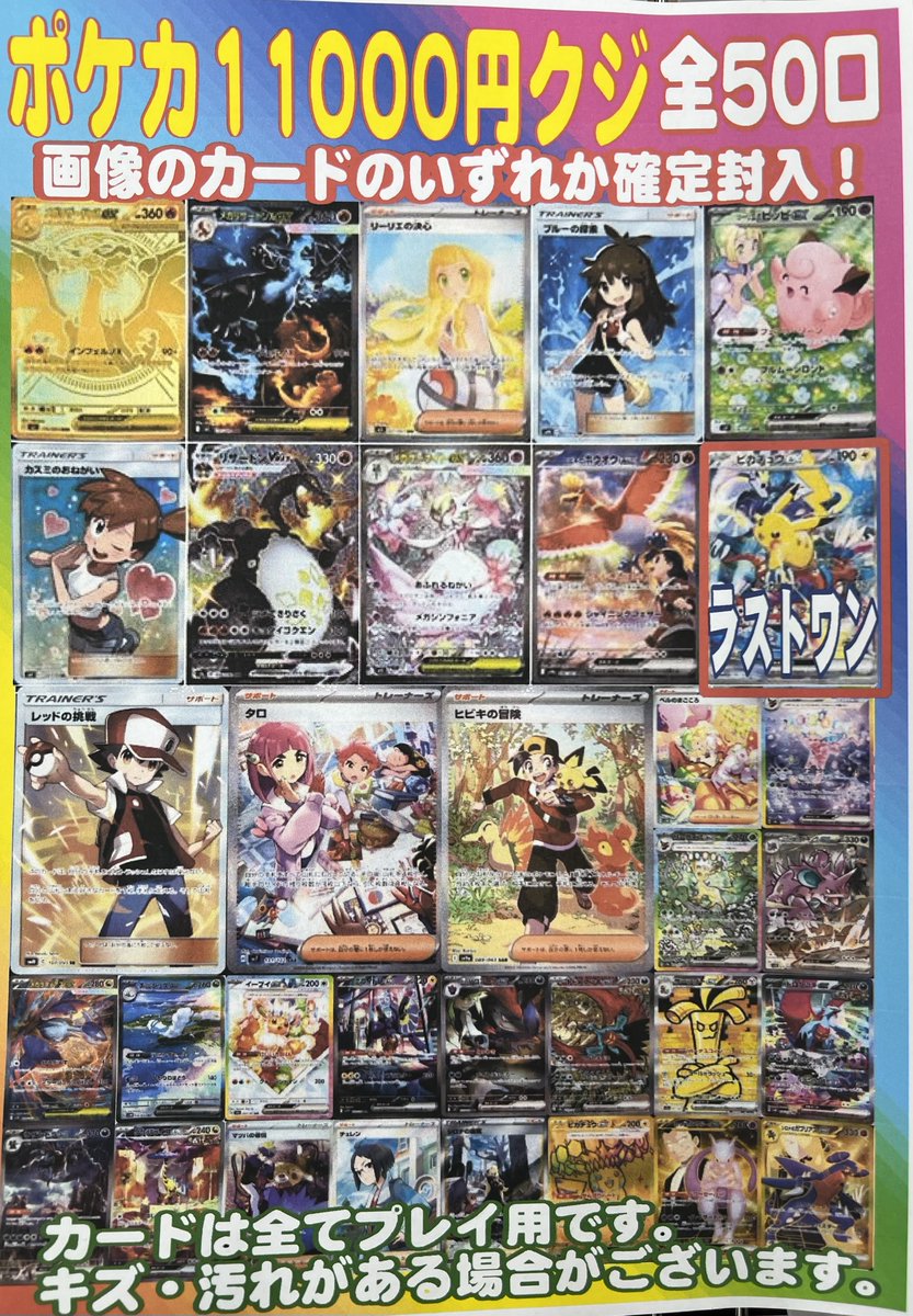 🌈ポケカ11,000円くじ🌈 全50口 本日より販売開始‼️ メガリザードン2種やリーリエの決心SARなど当たっちゃいます✨️ 是非ぜひお試しください(*´ω`*)