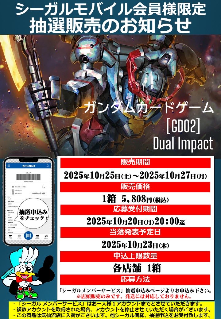 10月25日発売 #ガンダムカードゲーム ✅スタートデッキ Clan Unity [ST06] ✅ブースターパック Dual Impact [GD02] ただいま抽選受付中です! シーガルモバイル会員 「ガルモバ」 よりお申し込みいただけます✨ ぜひご応募ください! ※応募締切:10月20日(月)20:00まで