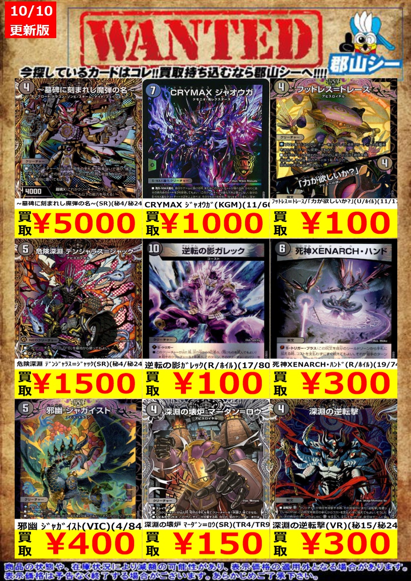シーガル郡山店デュエマノーマルお買取り情報!! ※商品の状態や在庫状況により減額の可能性があり、表示価格の適用外となる場合がございます。 シラズ死鬼の封 ¥30 暗闇の裏闇市 ¥200 漆黒の深淵 ジャシン帝(高価N)(1/13) ¥50