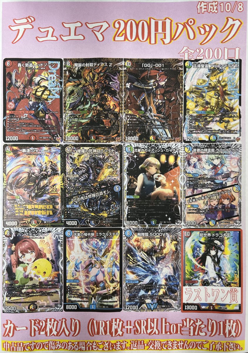 🌈デュエマ200円パック🌈 全200口 新しく販売開始致しました‼️ 邪道レッドゾーンやディアスシクなど当たります🎯✨️ ラストワンはドラゴ大王神アート💕 是非ぜひ摘んでみてくださいね(*´ω`*)