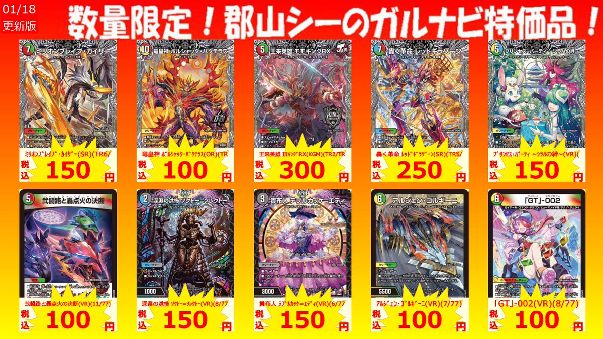 数量限定!郡山シー限定ガルナビ特価品 剣轟の団長 ドギラゴン王道(DMR)(DM1/DM1) ¥3,700 青寂の精霊龍 カーネル/サイレント・ジェラシー(U)(81/105) ¥100 SSS級天災 デッドダムド(SR)(TR7/TR9) ¥350 #デュエマ #シーガル郡山 #アツアツ特価