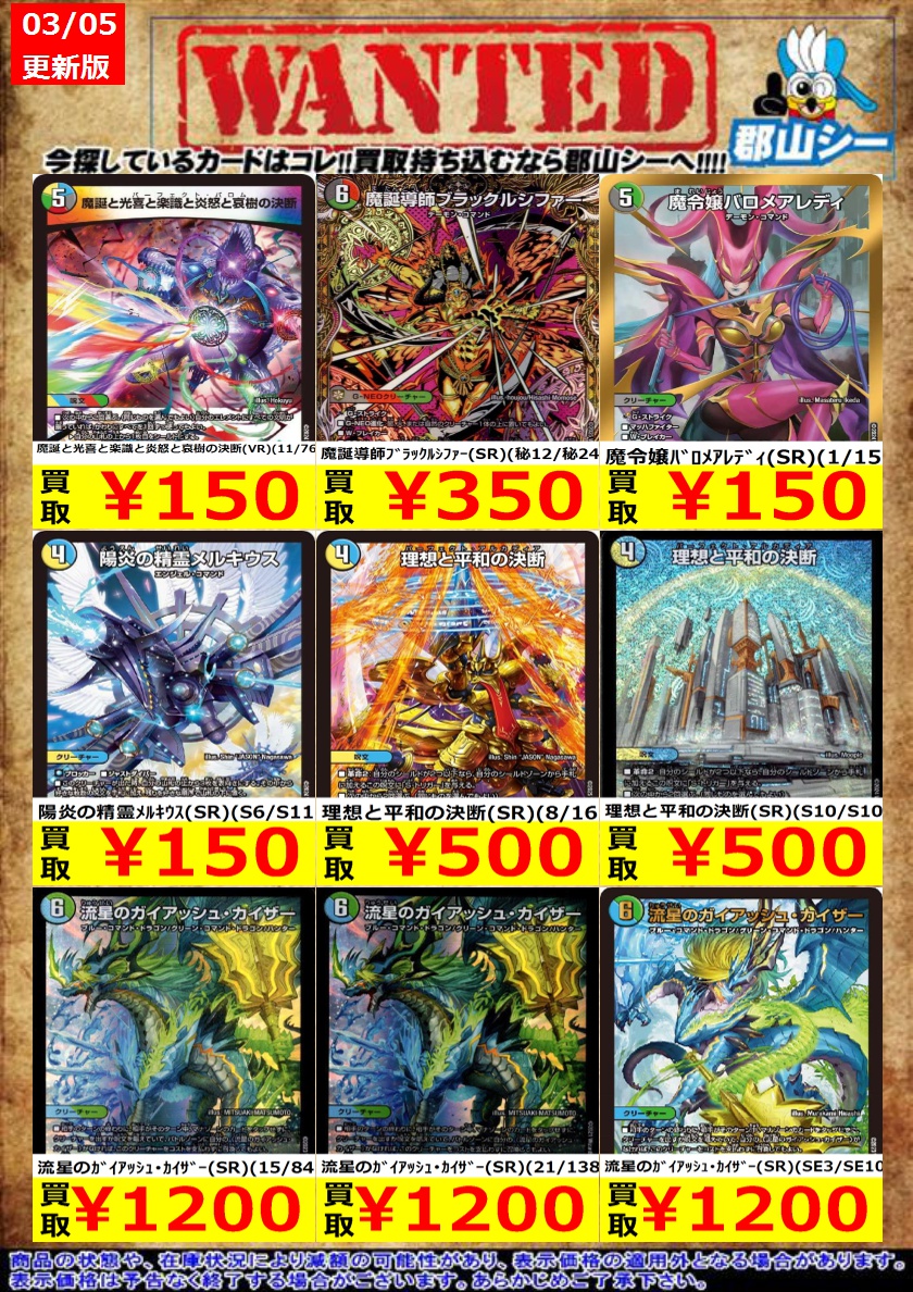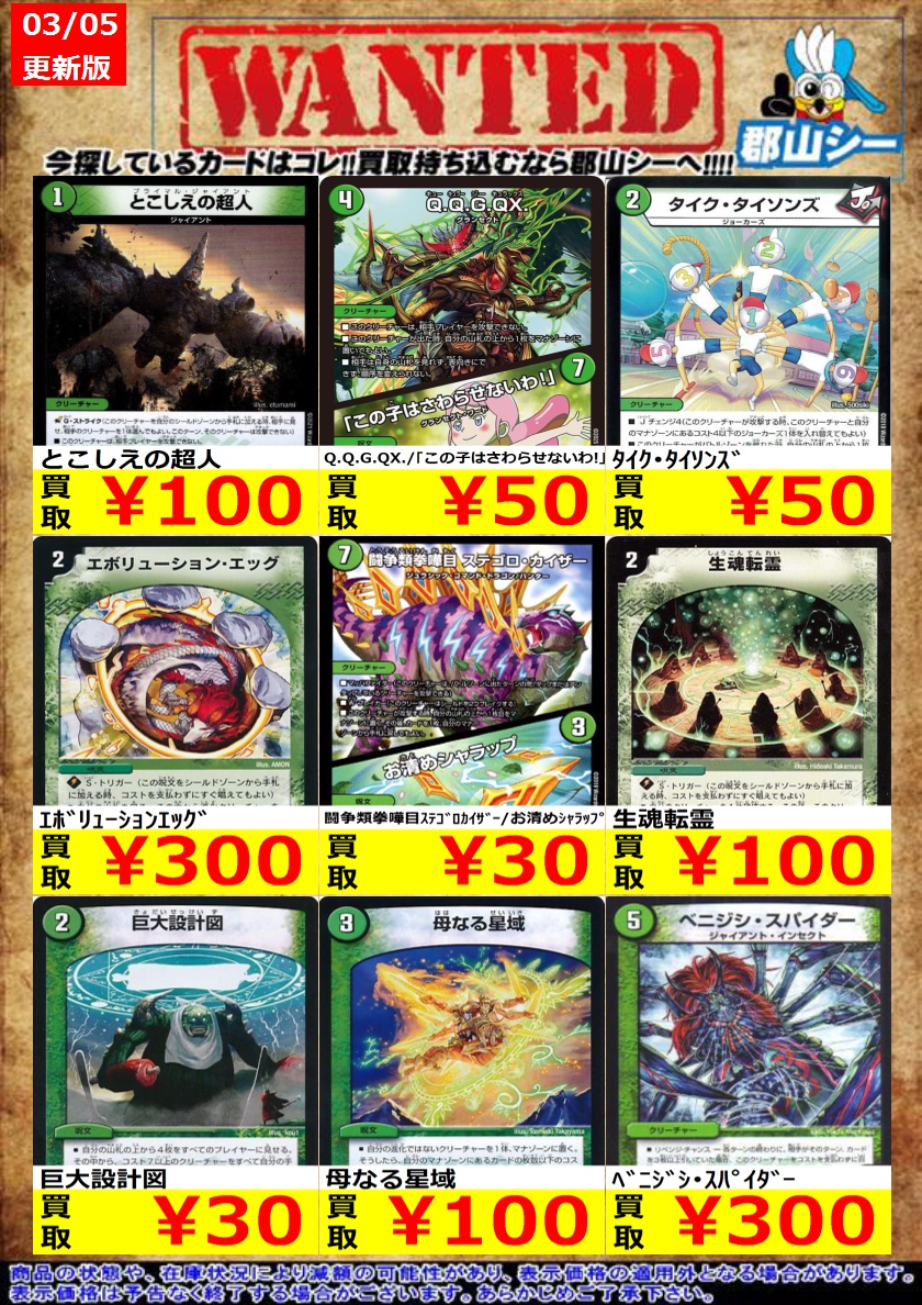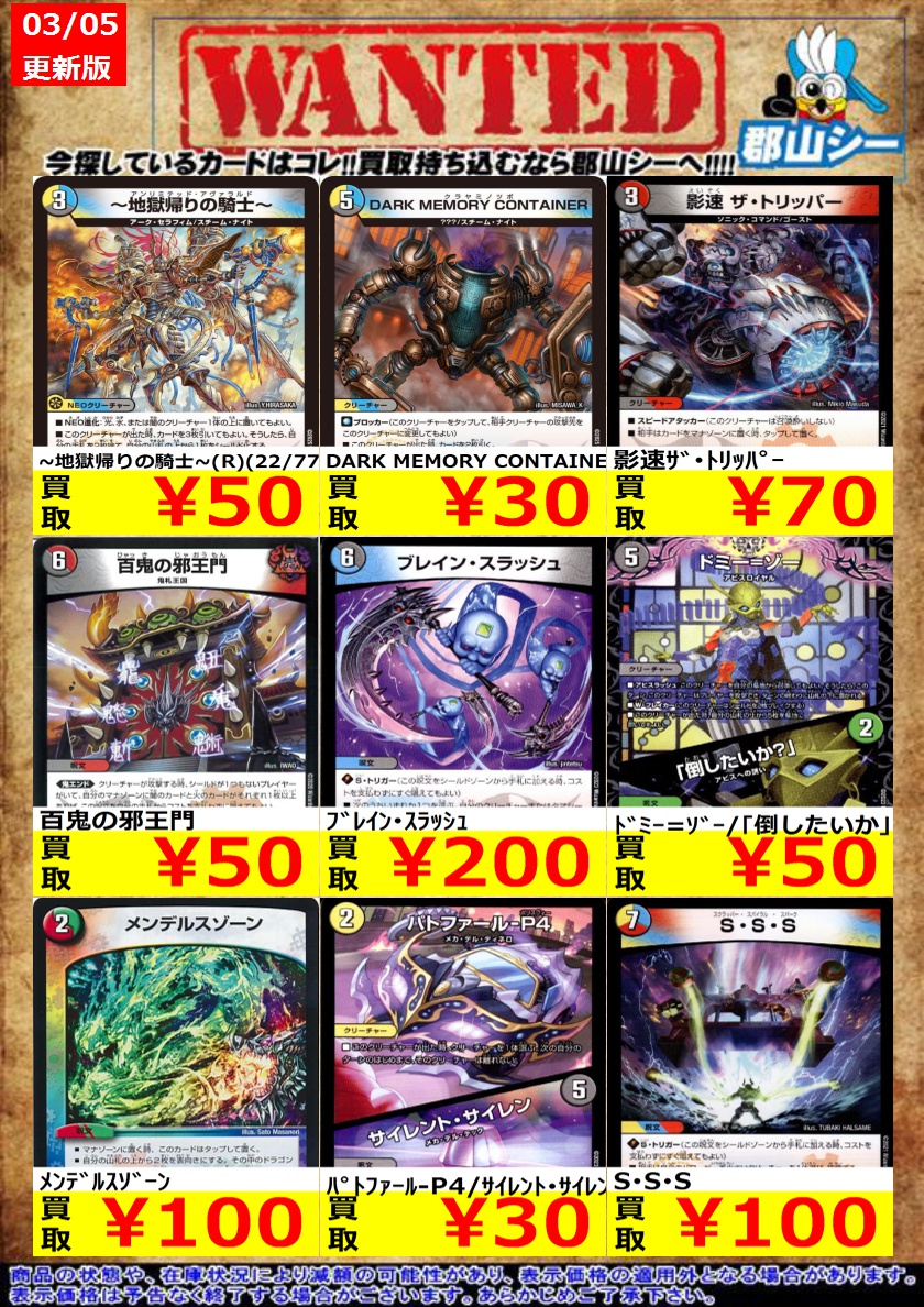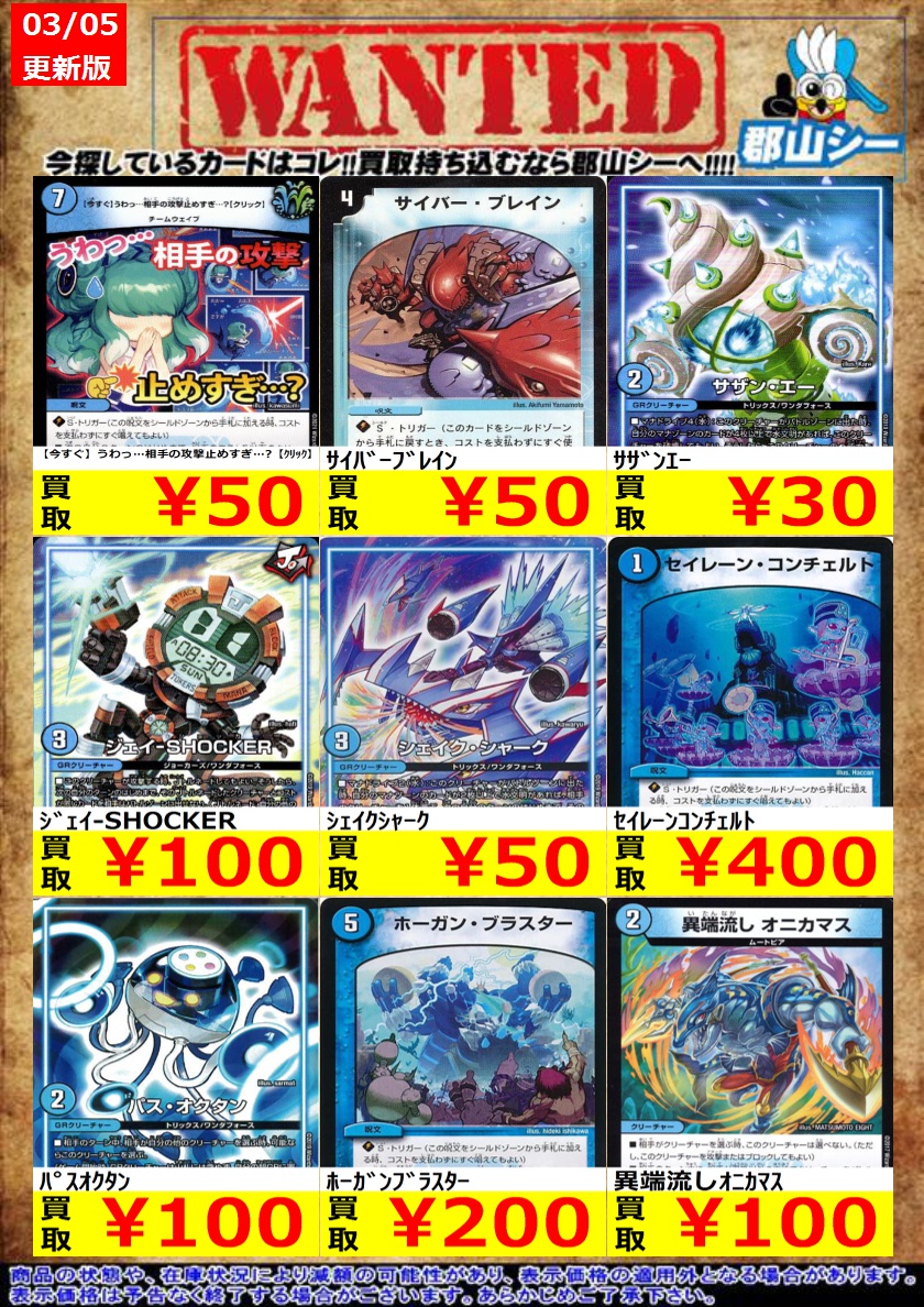 シーガル郡山店デュエマノーマルお買取り情報!! ※商品の状態や在庫状況により減額の可能性があり、表示価格の適用外となる場合がございます。 闘争類拳嘩目ステゴロカイザー/お清めシャラップ ¥30 配球の超人/記録的剛球 ¥30 配膳犬のトレス ¥30