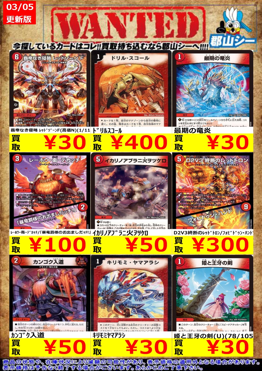 シーガル郡山店デュエマノーマルお買取り情報!! ※商品の状態や在庫状況により減額の可能性があり、表示価格の適用外となる場合がございます。 キリモミヤマアラシ ¥30 最期の竜炎 ¥30 覇帝なき侵略 レッドゾーンF(高価N)(1/11) ¥30