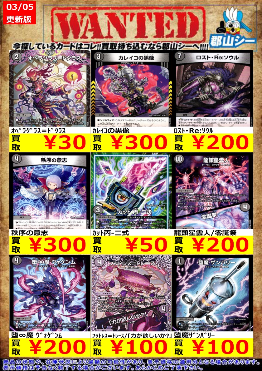 シーガル郡山店デュエマノーマルお買取り情報!! ※商品の状態や在庫状況により減額の可能性があり、表示価格の適用外となる場合がございます。 追憶人形ラビリピト ¥30 ヴィオラの黒像 ¥30 ジェニーの黒像 ¥30