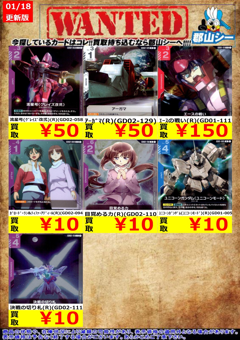 シーガル郡山店ガンダムCGお買取情報!! 目覚める力(R)(GD02-110) ¥10 流星号(グレイズ改弐)(R)(GD02-058) ¥50 エースの戦い(R)(GD01-111) ¥150