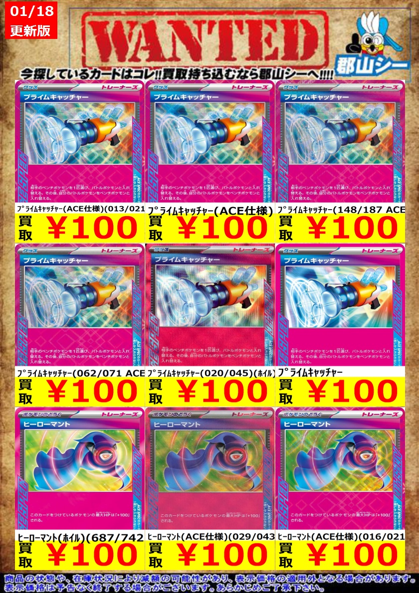 シーガル郡山店ポケカ数量限定お買取り情報更新です!よろしくお願いいたします! ※商品の状態や在庫状況により減額の可能性があり、表示価格の適用外となる場合がございます。 ヒーローマント(064/071 ACE) ¥100 プライムキャッチャー(148/187 ACE) ¥100
