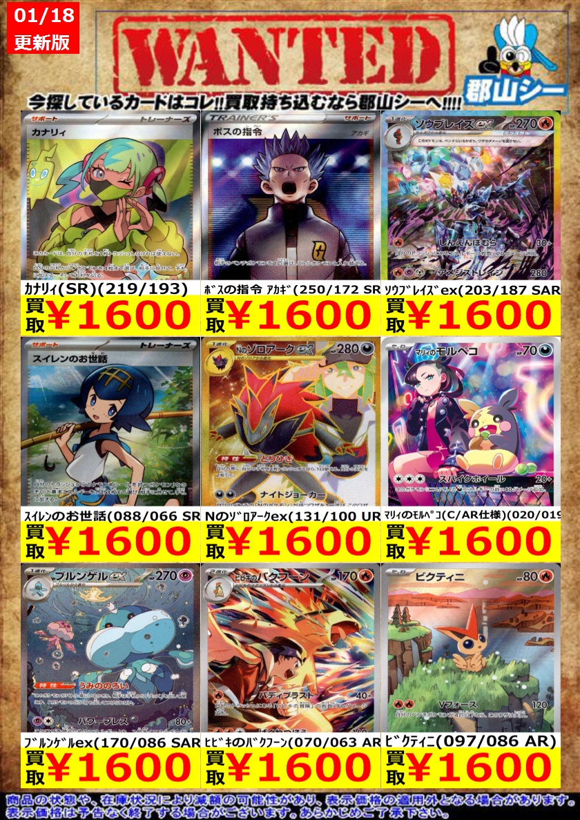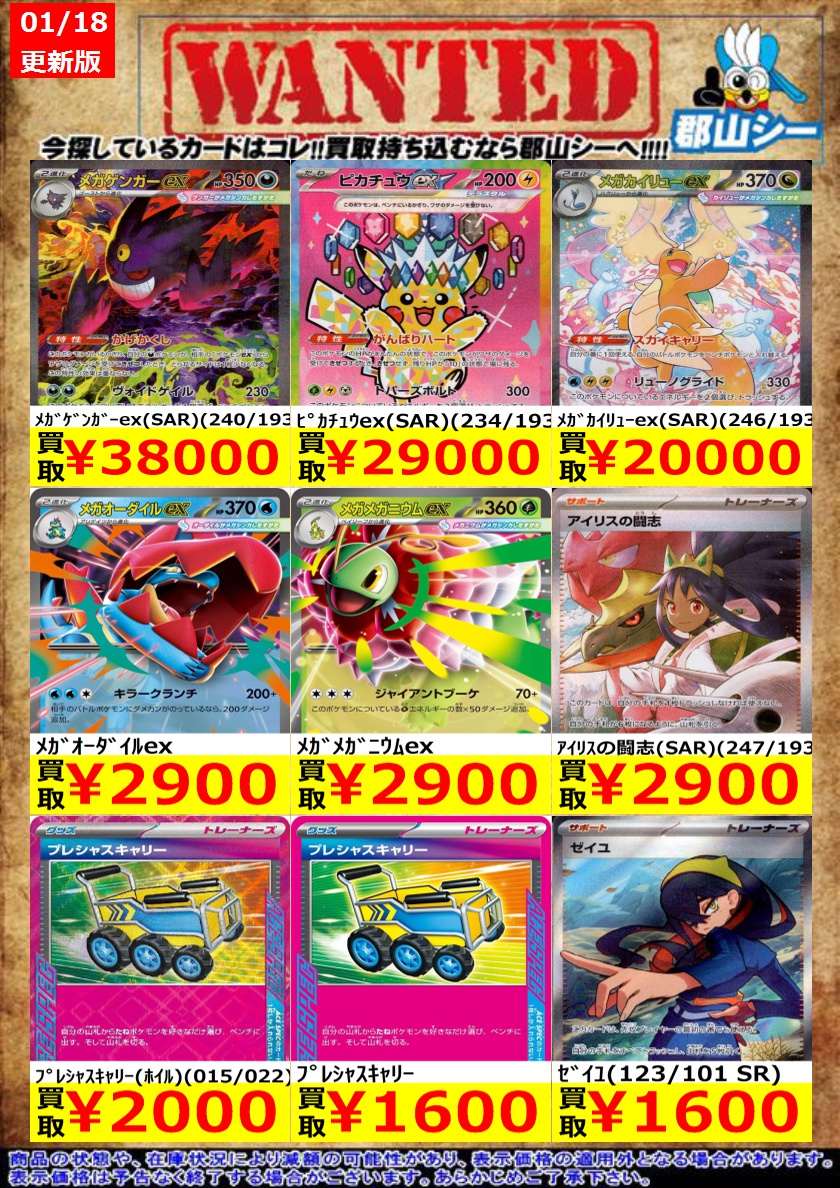 シーガル郡山店ポケカ数量限定お買取り情報更新です!よろしくお願いいたします! ※商品の状態や在庫状況により減額の可能性があり、表示価格の適用外となる場合がございます。 メガルカリオex(MA)(228/193) ¥800 カナリィ(SR)(219/193) ¥1,600 ヒカリ(SR)(106/080) ¥1,100