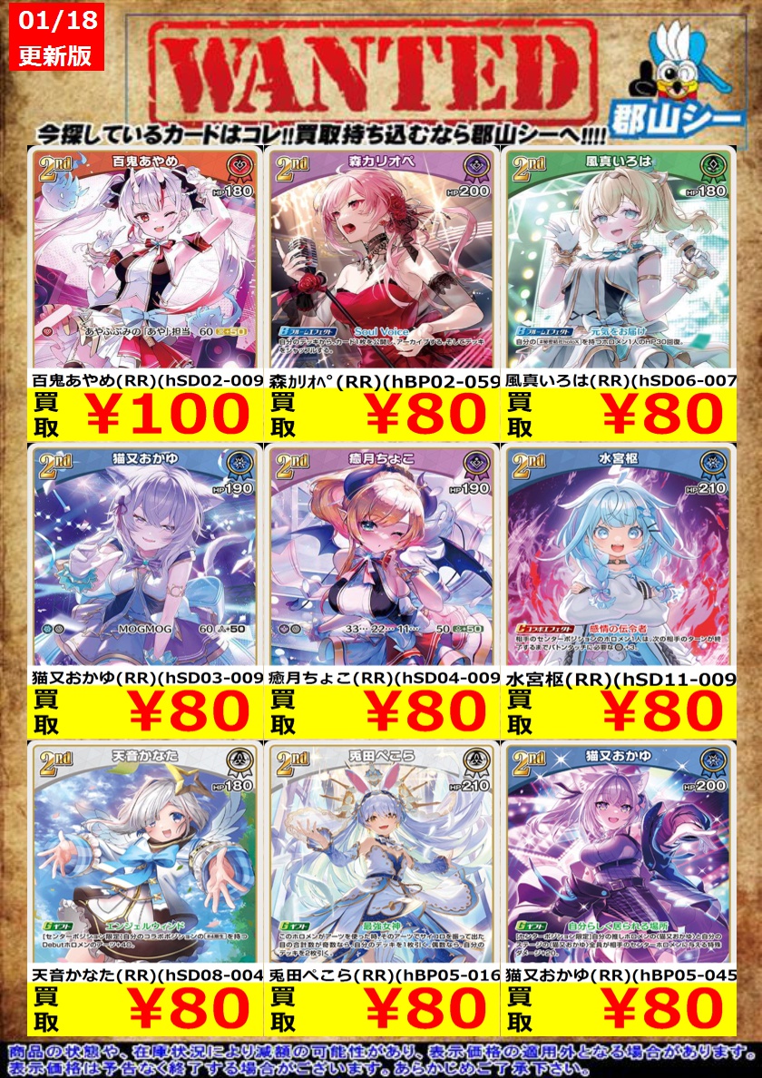 シーガル郡山店ホロライブOCGお買取り情報!! ※商品の状態や在庫状況により減額の可能性があり、表示価格の適用外となる場合がございます。 天音かなた(RR)(hBP01-014) ¥50 大空スバル(RR)(hBP06-081) ¥50 森カリオペ(RR)(hBP02-059) ¥80