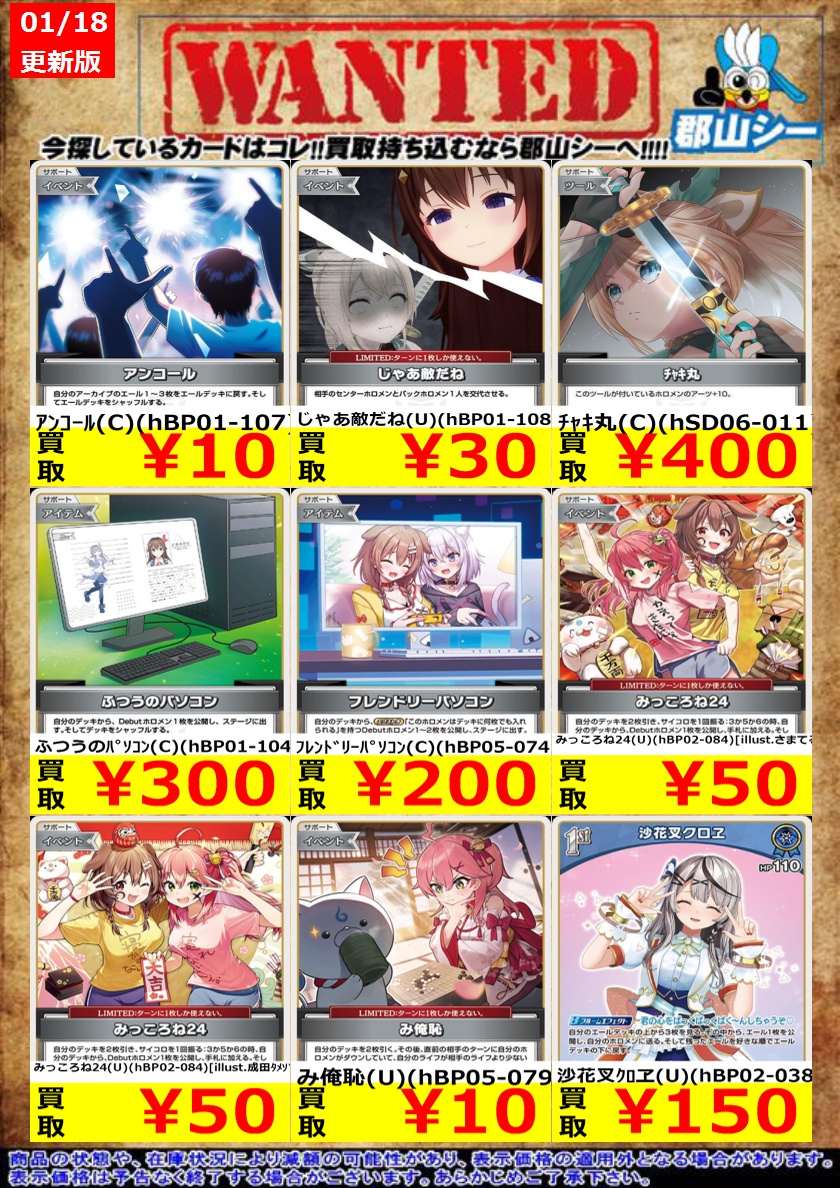 シーガル郡山店ホロライブOCGお買取り情報!! ※商品の状態や在庫状況により減額の可能性があり、表示価格の適用外となる場合がございます。 白銀ノエル(SR)(hBP02-016) ¥600 戌神ころね(SR)(hBP06-070) ¥1,000 百鬼あやめ(SR)(hBP06-039) ¥1,100