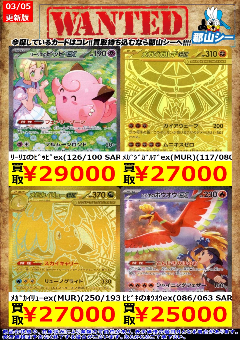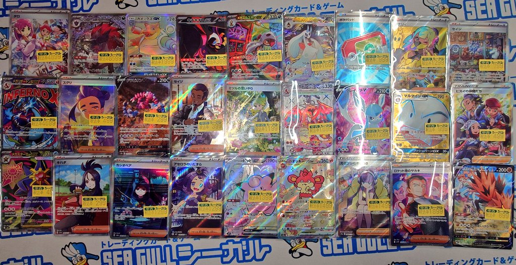 シーガル郡山店ポケカ数量限定お買取り情報更新です!よろしくお願いいたします! ※商品の状態や在庫状況により減額の可能性があり、表示価格の適用外となる場合がございます。 メガカイリューex(SAR)(246/193) ¥20,000 メイのはげまし(SAR)(115/080) ¥16,000
