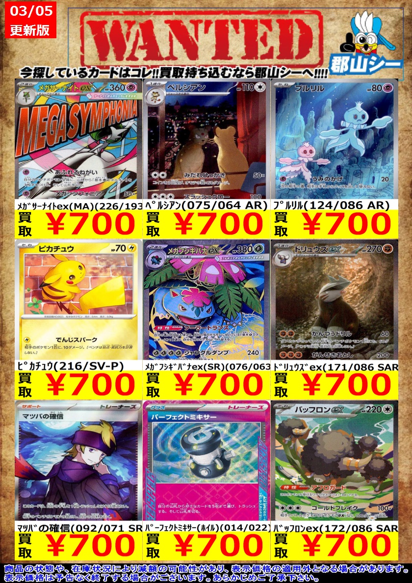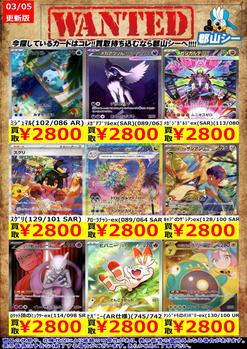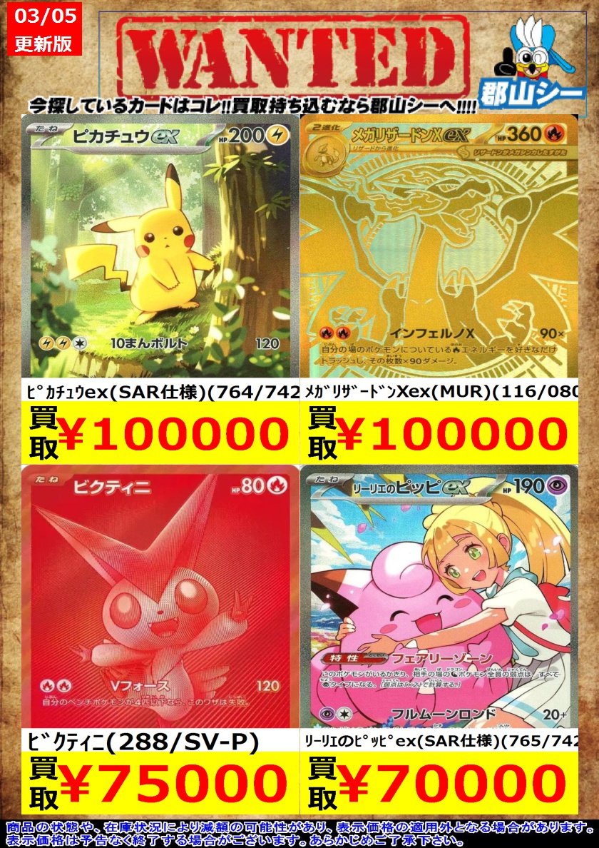 シーガル郡山店ポケカ数量限定お買取り情報更新です!よろしくお願いいたします! ※商品の状態や在庫状況により減額の可能性があり、表示価格の適用外となる場合がございます。 アカマツ(123/102 SR) ¥2,200 メガユキメノコex(SAR)(233/193) ¥2,400 メガピクシーex(SAR)(112/080) ¥2,400