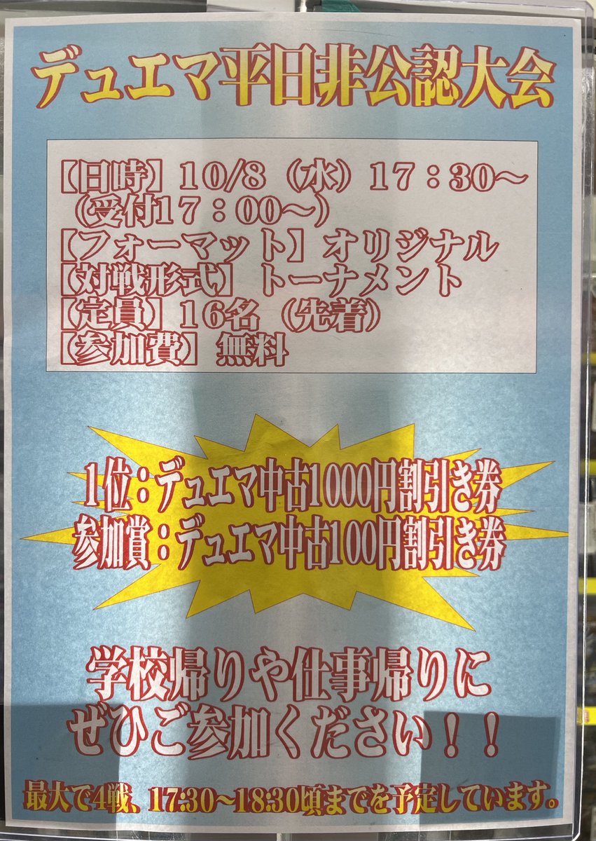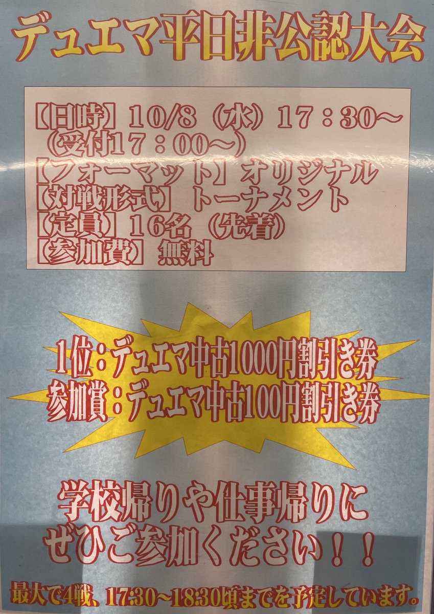 10/8日にデュエマ平日非公認大会を行います❗️ 参加費無料、優勝賞品はデュエマ中古1000円割引券です✨ ご参加お待ちしております🙇♂️