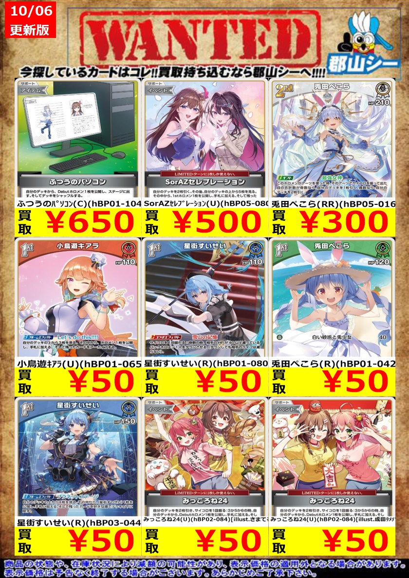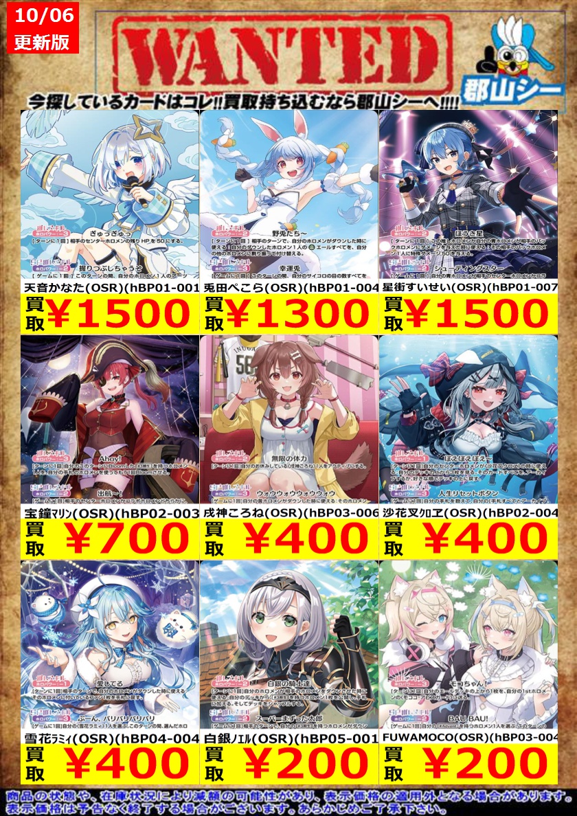 シーガル郡山店ホロライブOCGお買取り情報!! ※商品の状態や在庫状況により減額の可能性があり、表示価格の適用外となる場合がございます。 アイラニ・イオフィフティーン(OSR)(hBP05-002) ¥50 尾丸ポルカ(OSR)(hBP05-003) ¥50 猫又おかゆ(OSR)(hBP05-004) ¥50