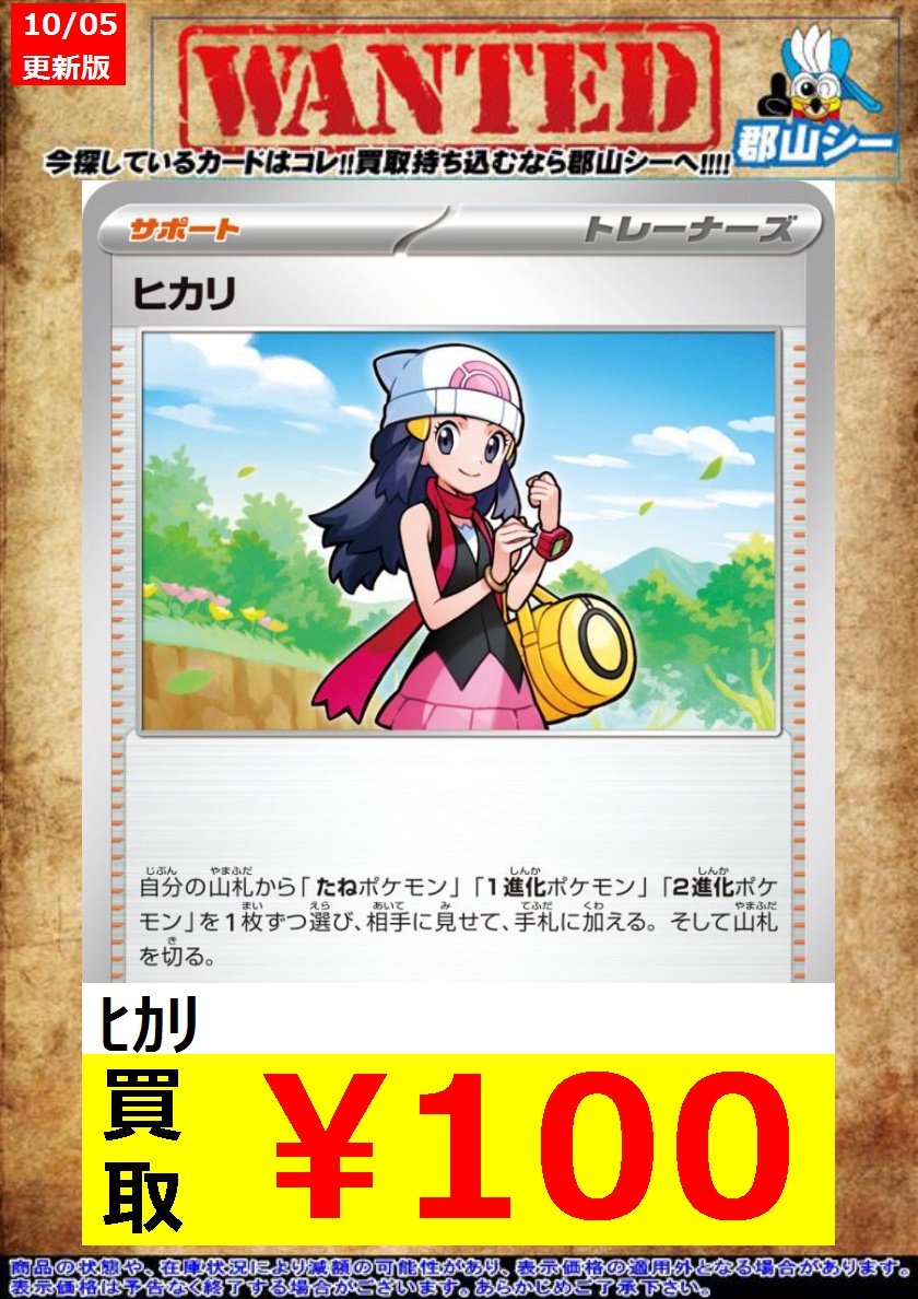 シーガル郡山店ポケカ数量限定お買取り情報更新です!よろしくお願いいたします! ※商品の状態や在庫状況により減額の可能性があり、表示価格の適用外となる場合がございます。 ヒカリ ¥100