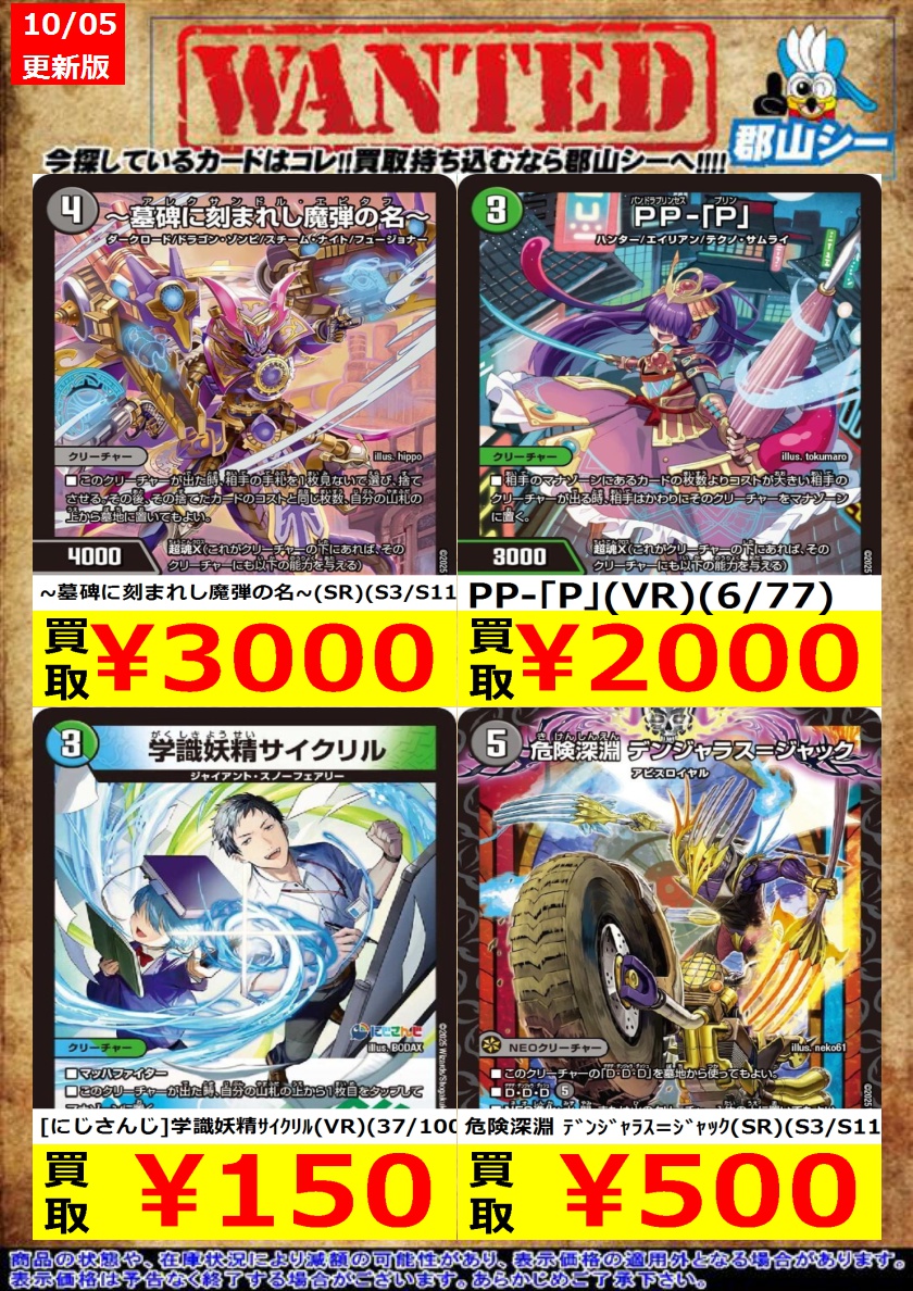 シーガル郡山店デュエマお買取り情報!! ※商品の状態や在庫状況により減額の可能性があり、表示価格の適用外となる場合がございます。 危険深淵 デンジャラス=ジャック(SR)(S3/S11) ¥500 PP-「P」(VR)(6/77) ¥2,000 ~墓碑に刻まれし魔弾の名~(SR)(S3/S11) ¥3,000