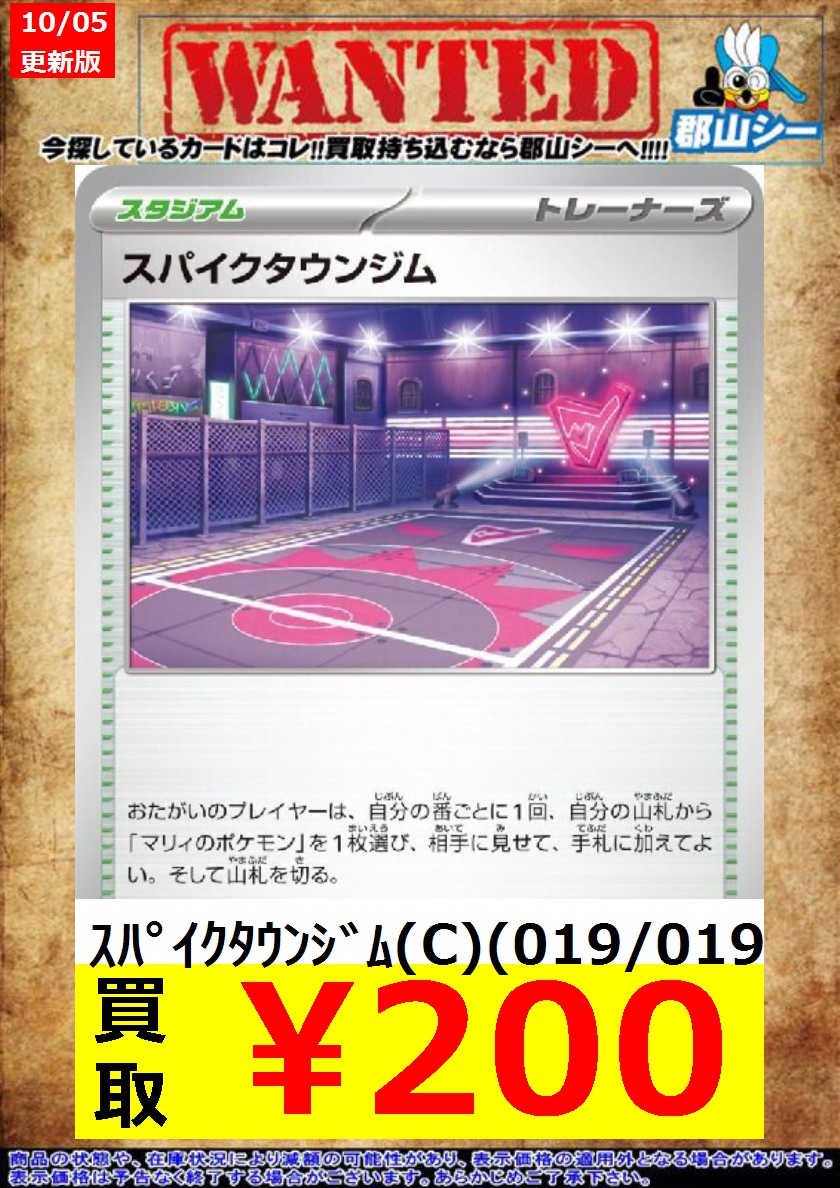 シーガル郡山店ポケカ数量限定お買取り情報更新です!よろしくお願いいたします! ※商品の状態や在庫状況により減額の可能性があり、表示価格の適用外となる場合がございます。 ヒカリ ¥100 スパイクタウンジム(C)(019/019) ¥200