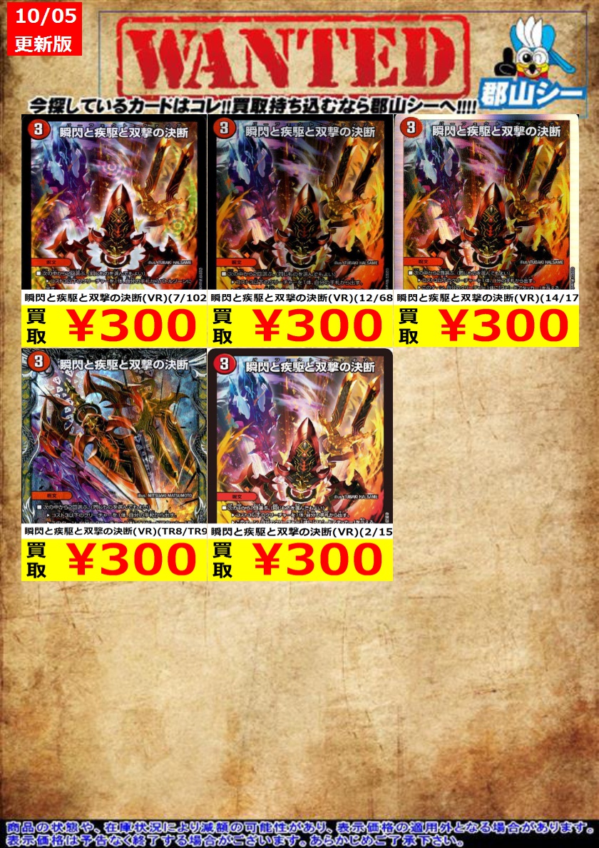 シーガル郡山店デュエマお買取り情報!! ※商品の状態や在庫状況により減額の可能性があり、表示価格の適用外となる場合がございます。 瞬閃と疾駆と双撃の決断(VR)(7/102) ¥300 瞬閃と疾駆と双撃の決断(VR)(TR8/TR9) ¥300 瞬閃と疾駆と双撃の決断(VR)(14/17) ¥300