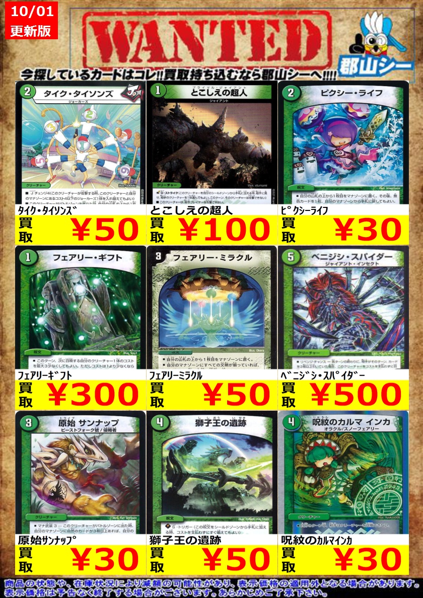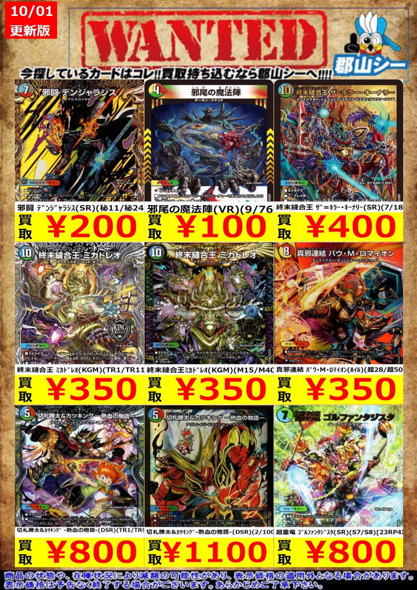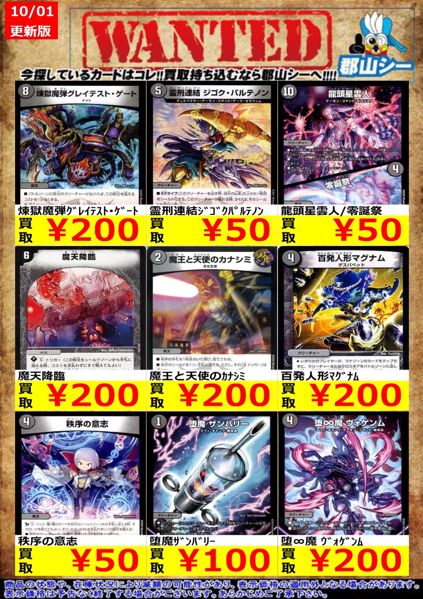 シーガル郡山店デュエマノーマルお買取り情報!! ※商品の状態や在庫状況により減額の可能性があり、表示価格の適用外となる場合がございます。 轟懐!切札MAX ¥100 悪魔妖精ベラドンナ ¥30 霊宝ヒャクメ-4 ¥30
