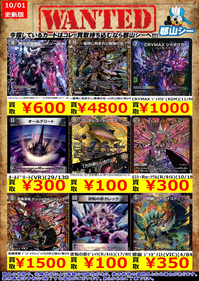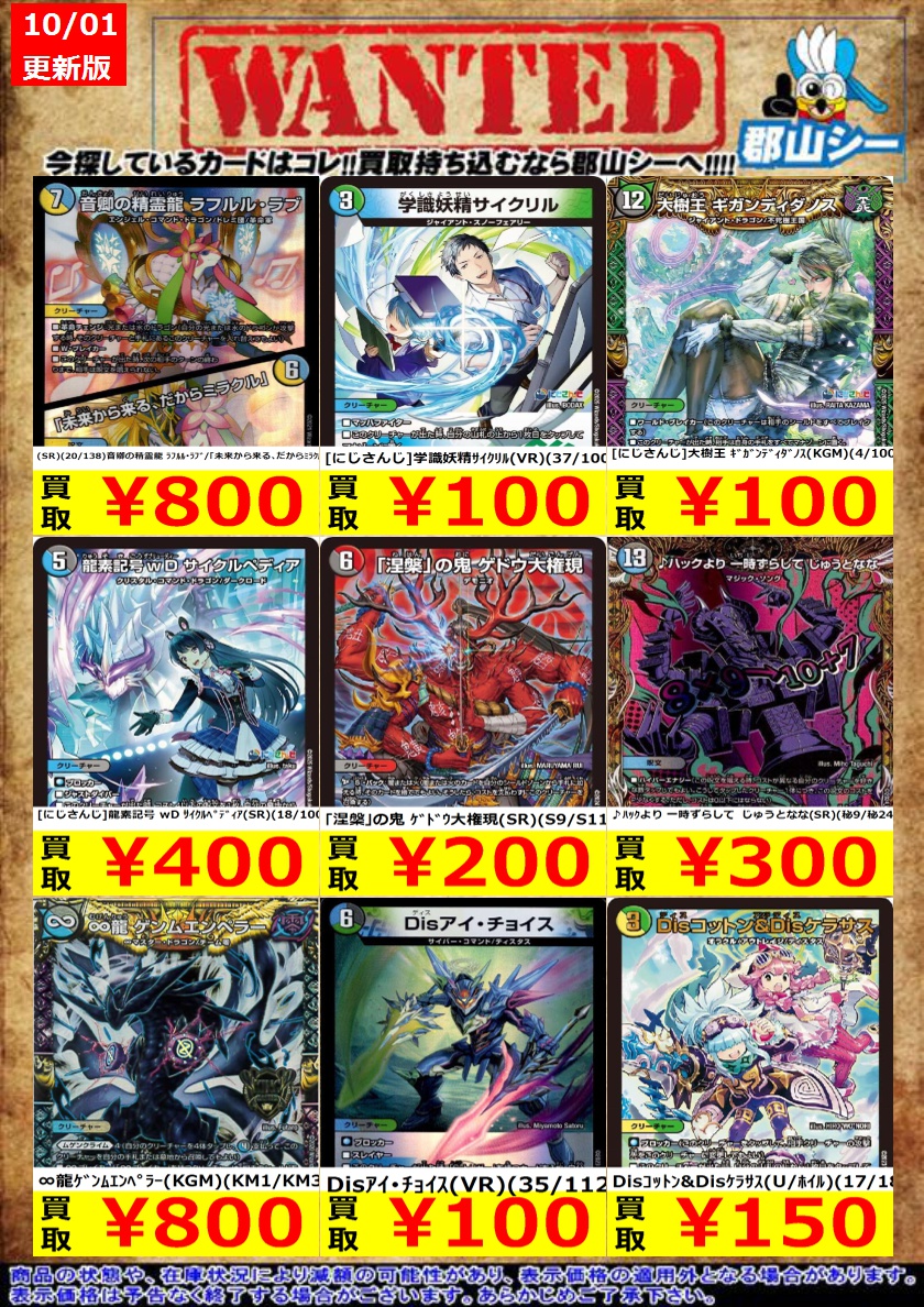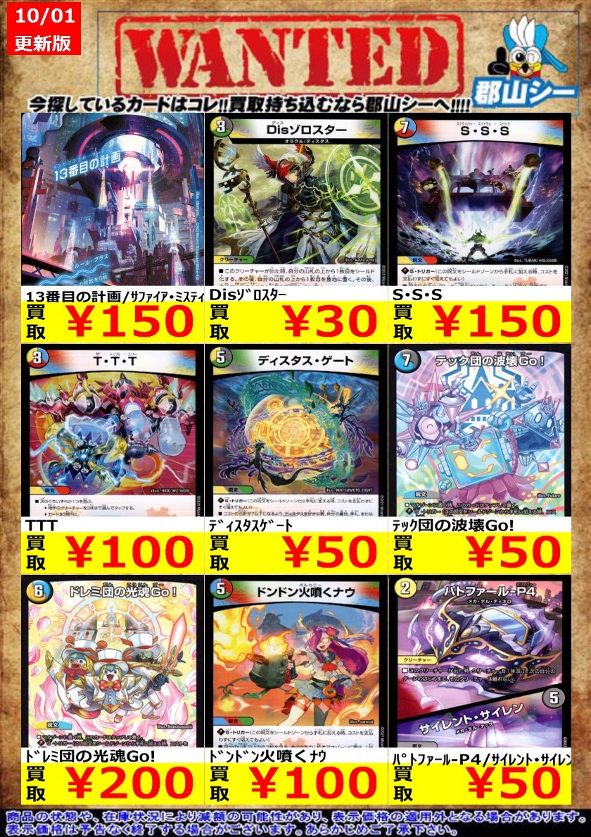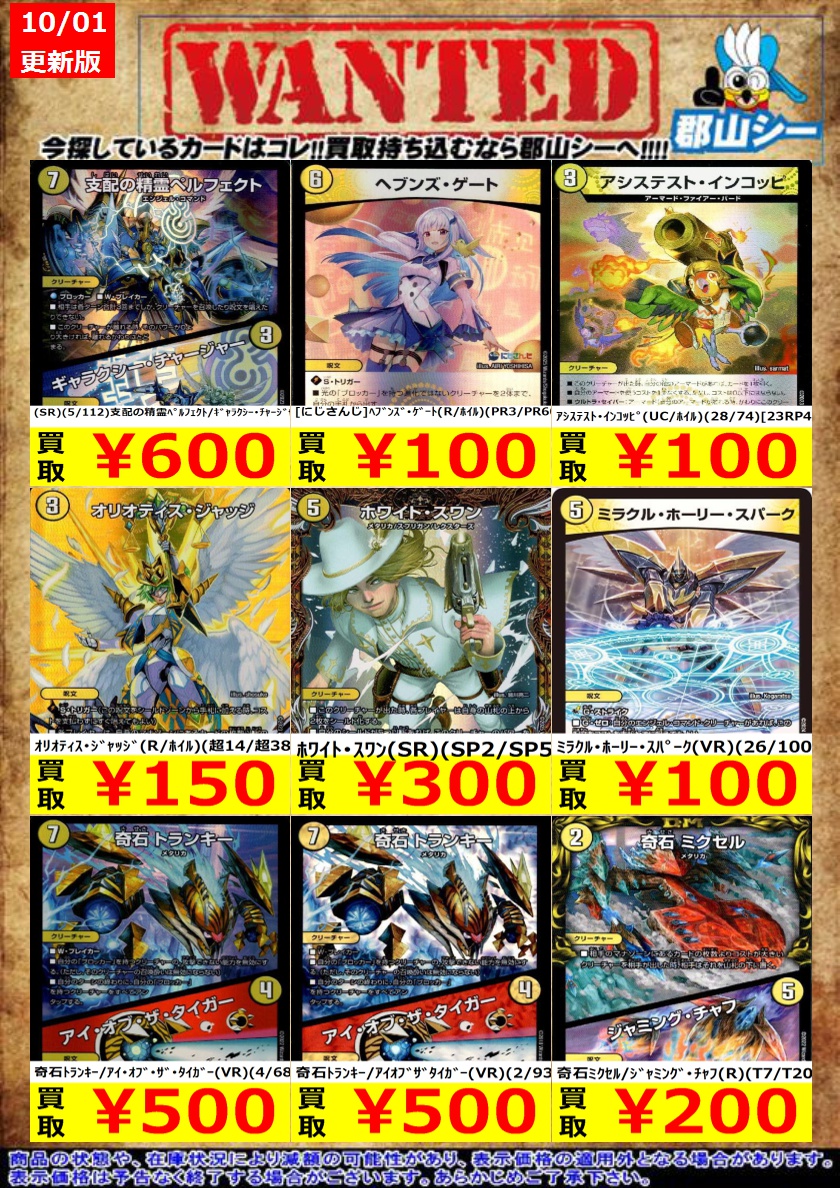 シーガル郡山店デュエマノーマルお買取り情報!! ※商品の状態や在庫状況により減額の可能性があり、表示価格の適用外となる場合がございます。 轟懐!切札MAX ¥100 悪魔妖精ベラドンナ ¥30 霊宝ヒャクメ-4 ¥30