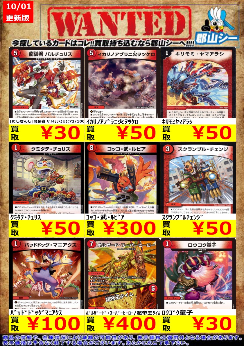 シーガル郡山店デュエマノーマルお買取り情報!! ※商品の状態や在庫状況により減額の可能性があり、表示価格の適用外となる場合がございます。 [にじさんじ]龍装者 バルチュリス(U)(72/100) ¥30 コッコ・武・ルピア ¥300 ボルザード・スーパーヒーロー/超帝王タイム ¥400