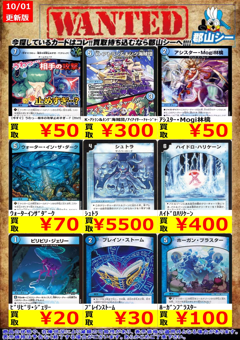 シーガル郡山店デュエマノーマルお買取り情報!! ※商品の状態や在庫状況により減額の可能性があり、表示価格の適用外となる場合がございます。 デビルドレーン ¥300 九番目の旧王 ¥50 秩序の意志 ¥50