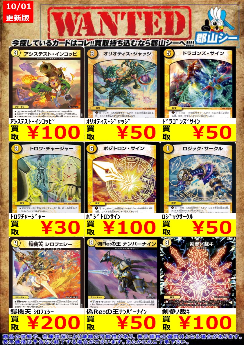 シーガル郡山店デュエマノーマルお買取り情報!! ※商品の状態や在庫状況により減額の可能性があり、表示価格の適用外となる場合がございます。 ドラゴンズサイン ¥50 ロジックサークル ¥50 煌世主ノ正裁Z ¥100