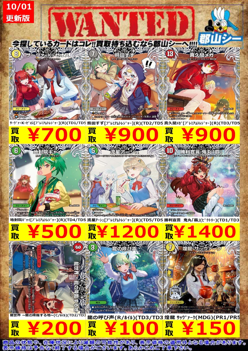 シーガル郡山店デュエマお買取り情報!! ※商品の状態や在庫状況により減額の可能性があり、表示価格の適用外となる場合がございます。 流星のガイアッシュ・カイザー(SR)(PR4/PR5) ¥1,800 地封龍 ギャイア(SR)(PR3/PR5) ¥2,000 切札勝太&カツキング -熱血の物語-(DSR)(TD1/TD16) ¥2,200