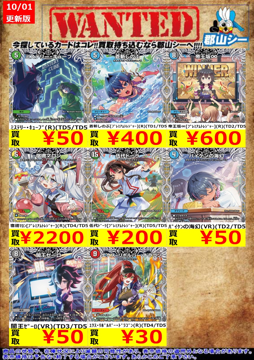 シーガル郡山店デュエマお買取り情報!! ※商品の状態や在庫状況により減額の可能性があり、表示価格の適用外となる場合がございます。 闇王ゼーロ(VR)(TD3/TD5) ¥50 バイケンの海幻(VR)(TD2/TD5) ¥50 エクス・リボルバー・ドラゴン(R)(TD4/TD5) ¥30