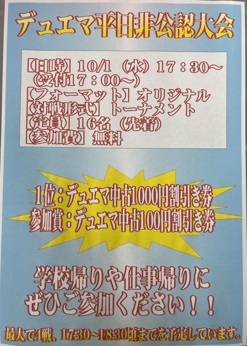 本日17:30〜 毎週水曜恒例のデュエマ非公認あります!! 受付は17:00から先着16名となります! ご参加お待ちしております〜😁