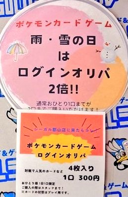 シーガル郡山店です! ポケモンカード レジにて販売中 ログインオリパ 通常1口までのところ本日は雨の日2倍デー 2口までご購入いただけます! お求めの際はレジスタッフまで✨ ご来店お待ちしております😊