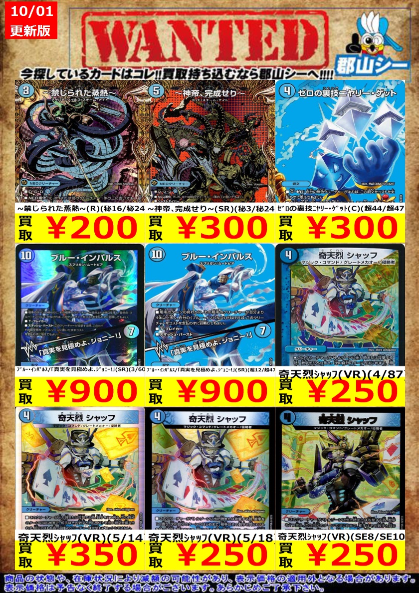 シーガル郡山店デュエマお買取り情報!! ※商品の状態や在庫状況により減額の可能性があり、表示価格の適用外となる場合がございます。 ~禁じられた蒸熱~(R)(秘16/秘24) ¥200 ~神帝、完成せり~(SR)(秘3/秘24) ¥300 奇天烈シャッフ(VR)(5/14) ¥350