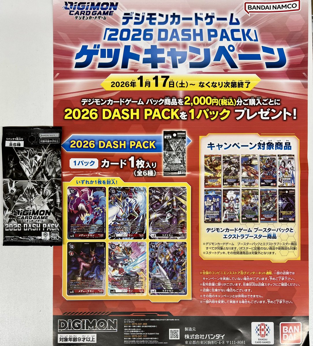 明日17(土)〜キャンペーン開始🎉 デジモンカードの新品ブースターパックを税込2000円購入ごとに、「2026DASH PACK」を1パックプレゼント🎁 ※無くなり次第終了となります🙇♂️