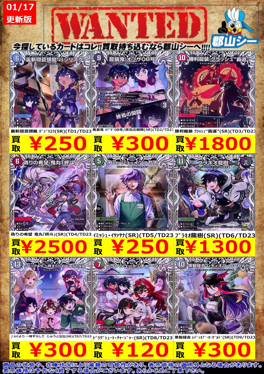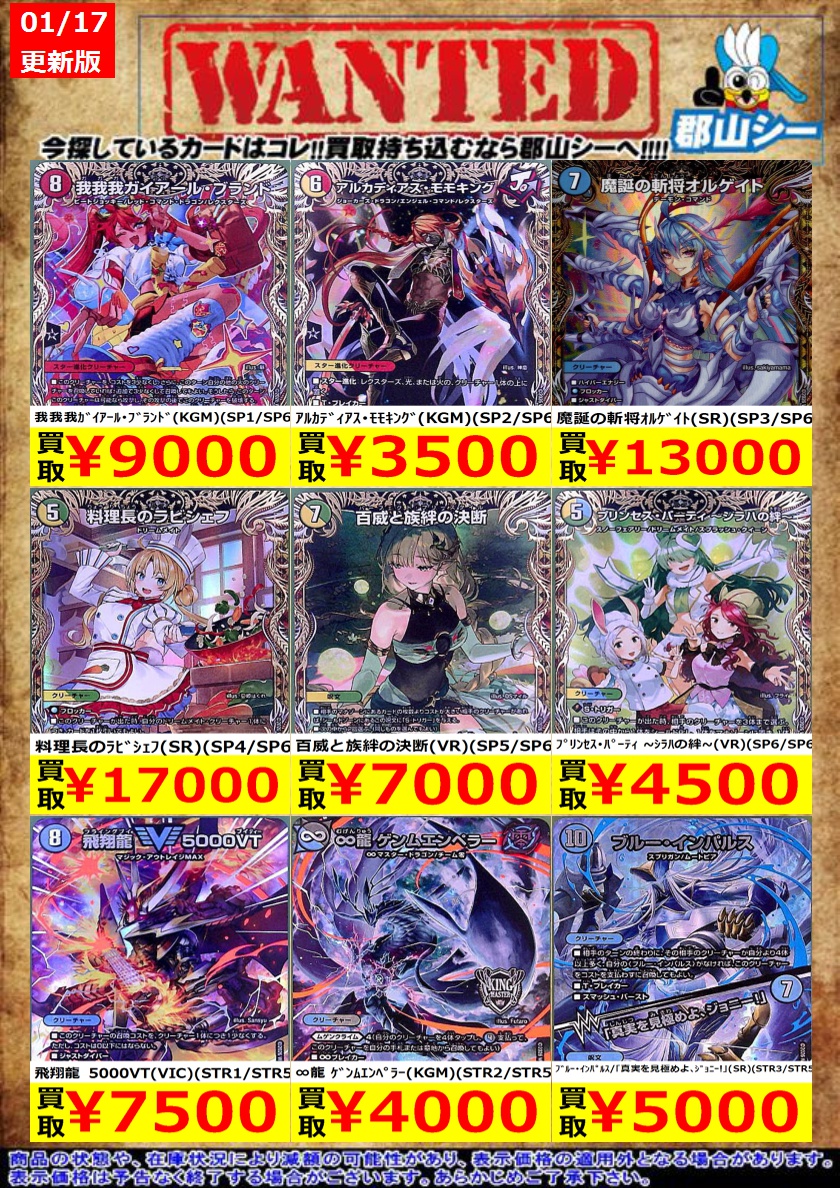 シーガル郡山店デュエマお買取り情報!! ※商品の状態や在庫状況により減額の可能性があり、表示価格の適用外となる場合がございます。 煌銀河最終形態 ギラングレイル(VR)(CSP2/CSP5) ¥2,500 エンドレス・フローズン・カーニバル(VR)(CSP5/CSP5) ¥3,000