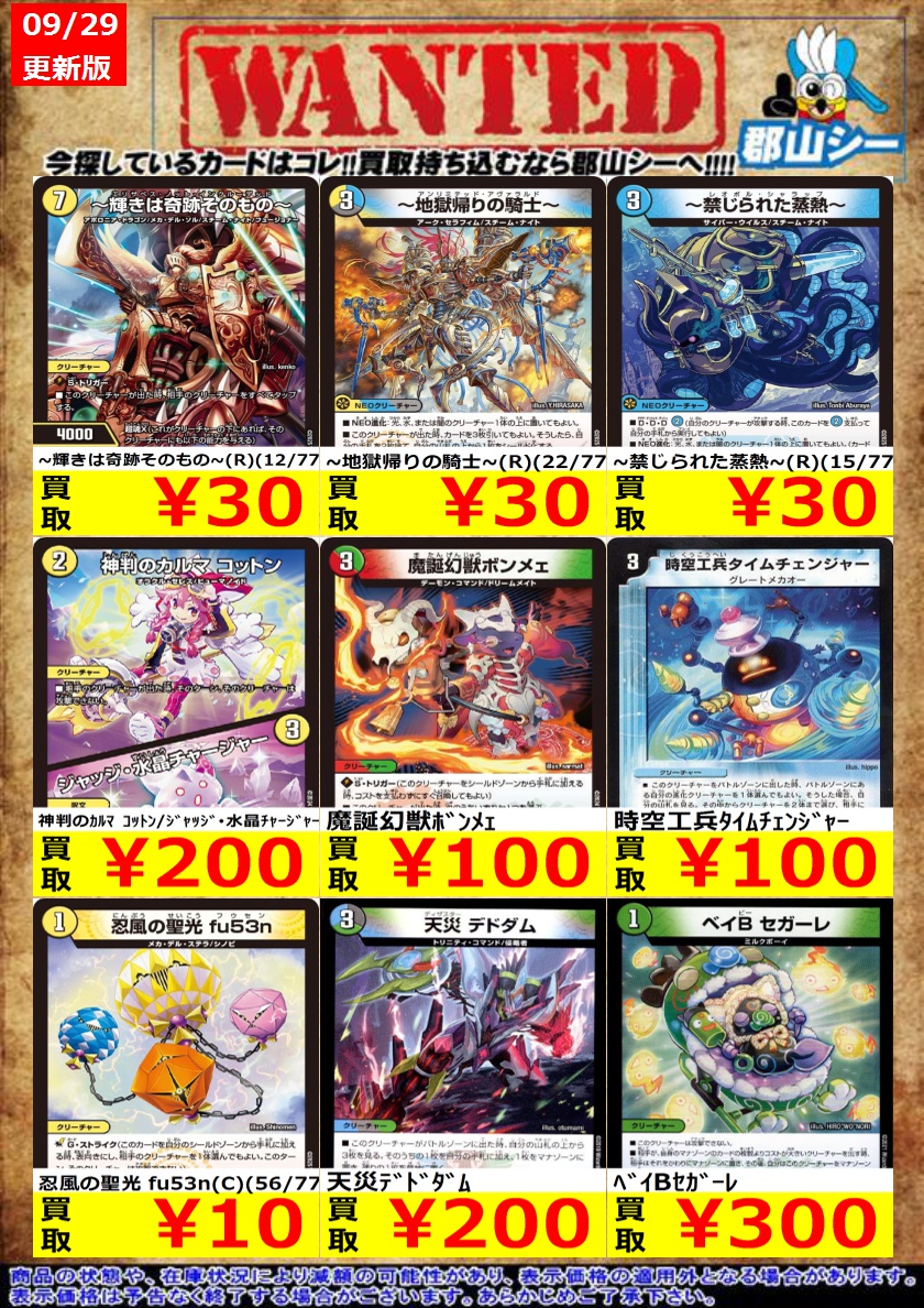 シーガル郡山店デュエマノーマルお買取り情報!! ※商品の状態や在庫状況により減額の可能性があり、表示価格の適用外となる場合がございます。 ~輝きは奇跡そのもの~(R)(12/77) ¥30 忍風の聖光 fu53n(C)(56/77) ¥10 ~禁じられた蒸熱~(R)(15/77) ¥30