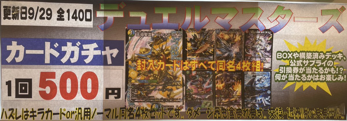 デュエマ500円自販機を補充いたしました❗️ 今回の大当たりは王導聖霊アルファディオス4枚セットです✨ よろしくお願いします🙇♂️