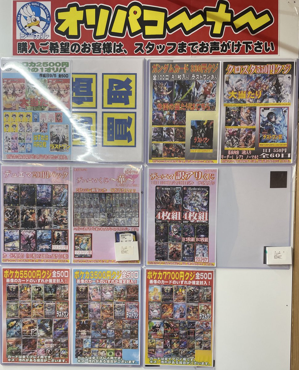 こんにちは(」・ω・) シーガル郡山店です。 ただいま展開中のオリパ各種はこちら⬇️⬇️ となっております。 ご来店お待ちしております(*^^*)