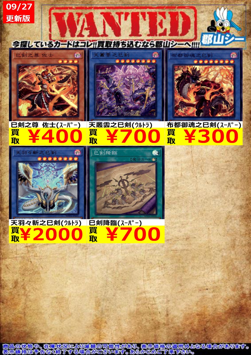 シーガル郡山店遊戯王お買取り情報 ※商品の状態や在庫状況により減額の可能性があり、表示価格の適用外となる場合がございます。 布都御魂之巳剣(スーパー) ¥300 巳剣之尊 佐士(スーパー) ¥400 天叢雲之巳剣(ウルトラ) ¥700 #遊戯王 #シーガル #郡山店