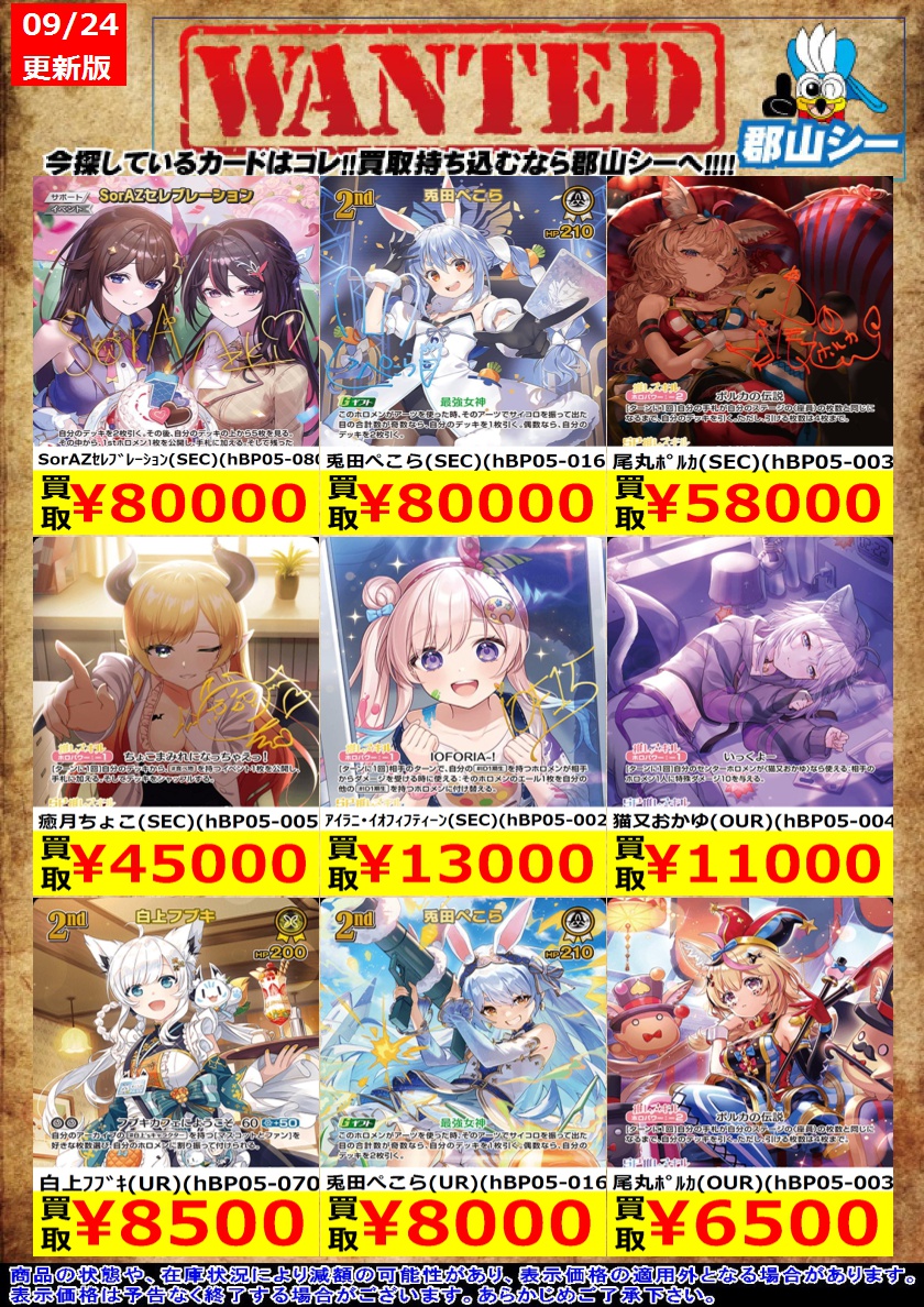 シーガル郡山店ホロライブOCGお買取り情報!! ※商品の状態や在庫状況により減額の可能性があり、表示価格の適用外となる場合がございます。 アイラニ・イオフィフティーン(UR)(hBP05-023) ¥800 こぼ・かなえる(UR)(hBP05-049) ¥1,100 アキ・ローゼンタール(UR)(hBP05-027) ¥1,200