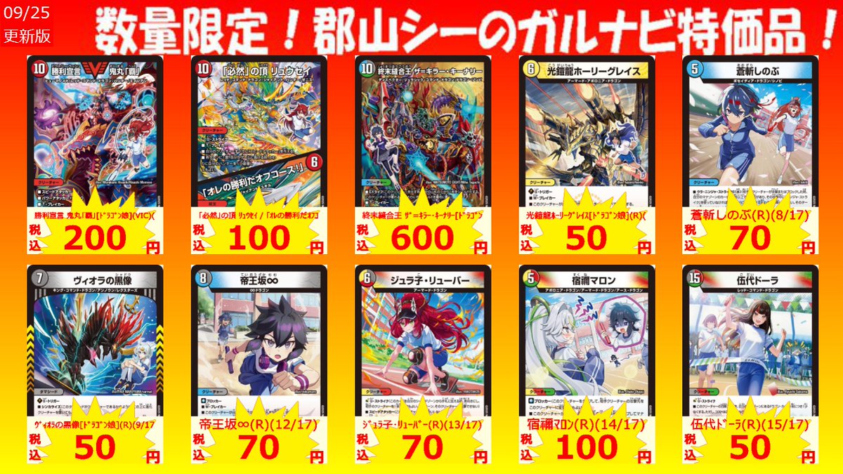 数量限定!郡山シー限定ガルナビ特価品 帝王坂∞(R)(12/17) ¥70 ジュラ子・リューバー(R)(13/17) ¥70 宿禰マロン(R)(14/17) ¥100 #デュエマ #シーガル郡山 #アツアツ特価