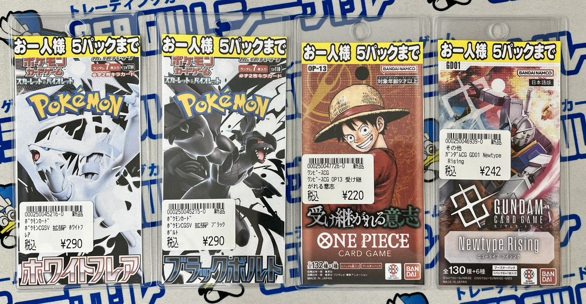 【入荷情報】 ポケモンカード ワンピースカード ガンダムカードゲーム パック販売中です✨ ※お一人様それぞれ5パックずつまでとなります。 皆様のご来店をお待ちしております😊