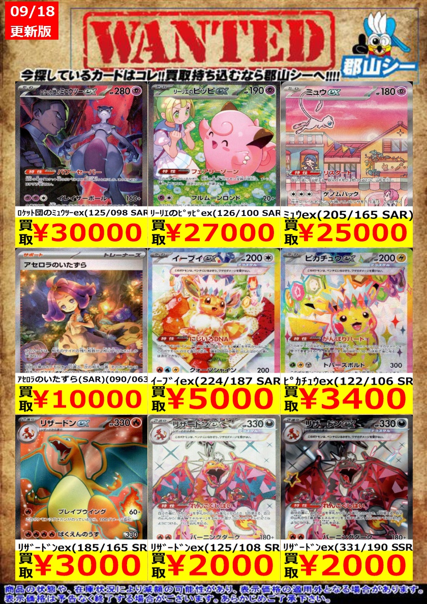 シーガル郡山店ポケカ数量限定お買取り情報更新です!よろしくお願いいたします! ※商品の状態や在庫状況により減額の可能性があり、表示価格の適用外となる場合がございます。 アセロラのいたずら(SR)(084/063) ¥2,500 メガガルーラex(SAR)(089/063) ¥3,400