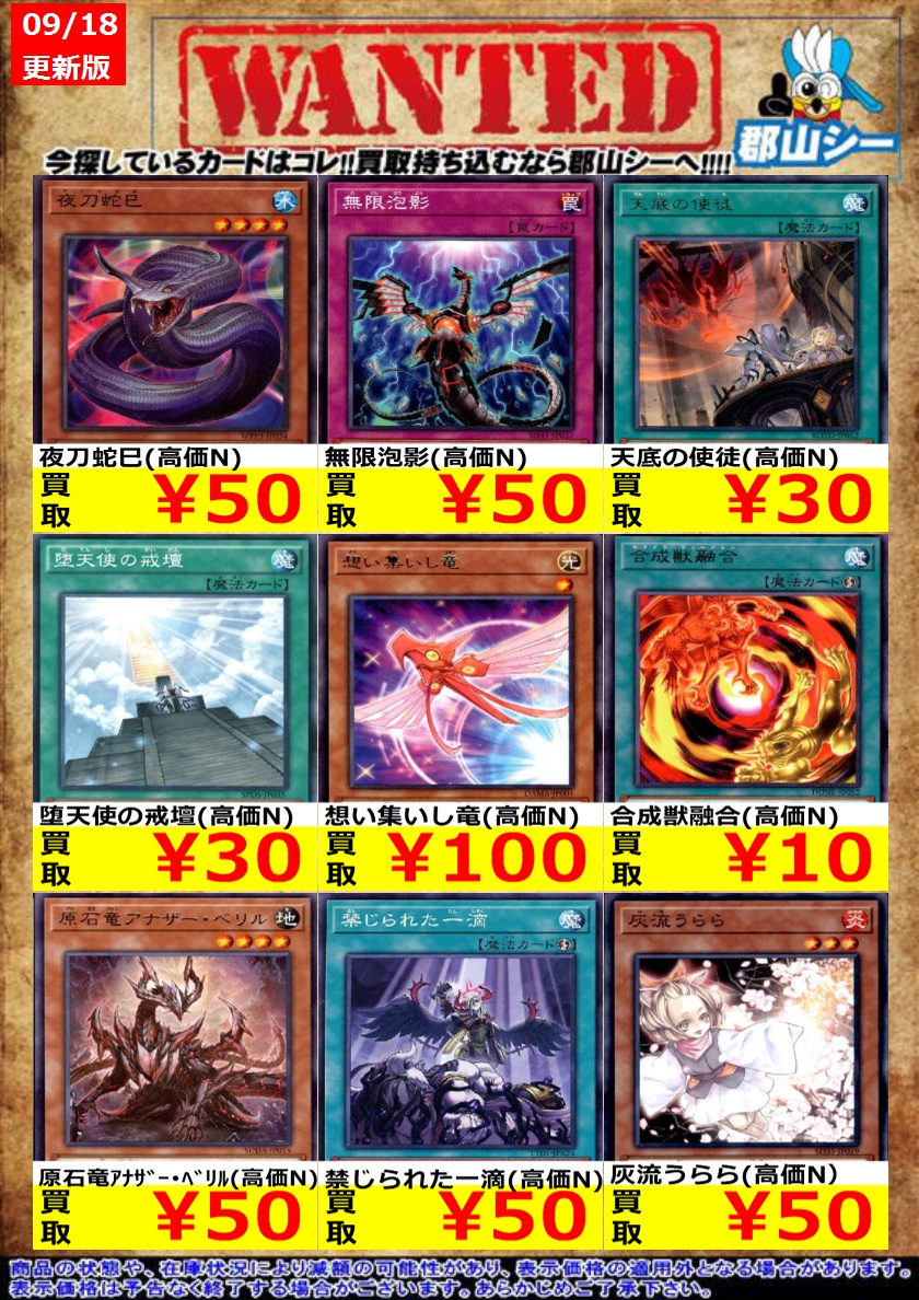 シーガル郡山店遊戯王お買取り情報 ※商品の状態や在庫状況により減額の可能性があり、表示価格の適用外となる場合がございます。 合成獣融合(高価N) ¥10 灰流うらら(高価N) ¥50 無限泡影(高価N) ¥50 #遊戯王 #シーガル #郡山店
