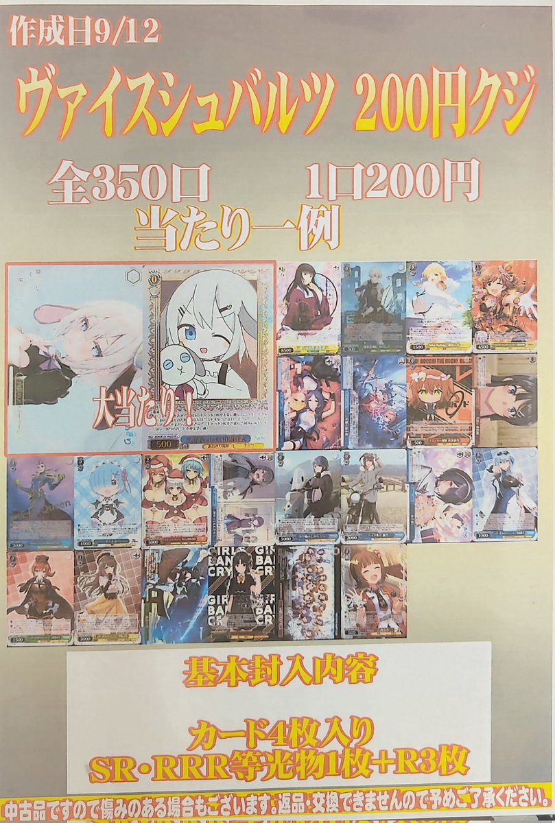 シーガル郡山店です! ヴァイスシュヴァルツ 200円クジ 作成いたしました✨ 全350口ご用意しております! よろしくお願いします‼️‼️